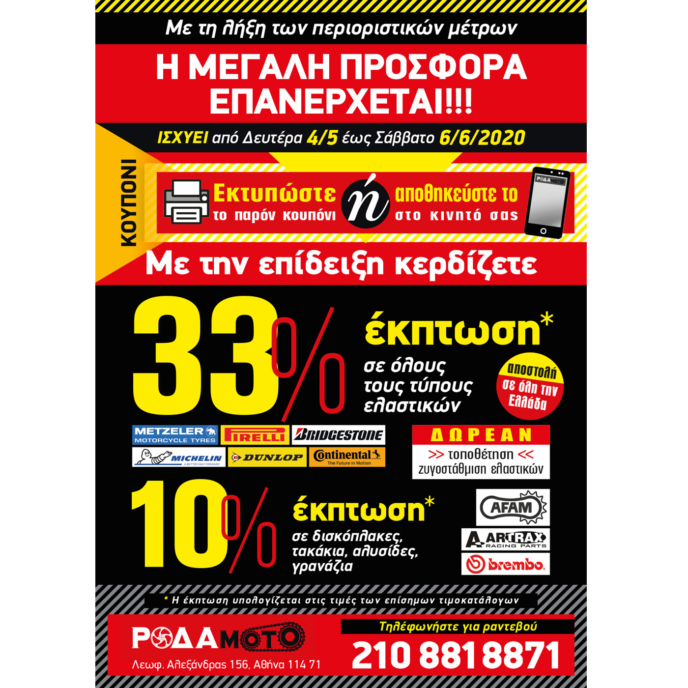 Απευθυνθήκαμε στην ΡΟΔΑ ΜΟΤΟ και εξασφαλίσαμε μία δυνατή έκπτωση 33% σε νέα ελαστικά και 10% σε δισκόπλακες, τακάκια, αλυσίδες και γρανάζια για όλους τους αναγνώστες, απλά και γρήγορα, με το ψηφιακό-κουπόνι που θα βρείτε παρακάτω στην σελίδα!