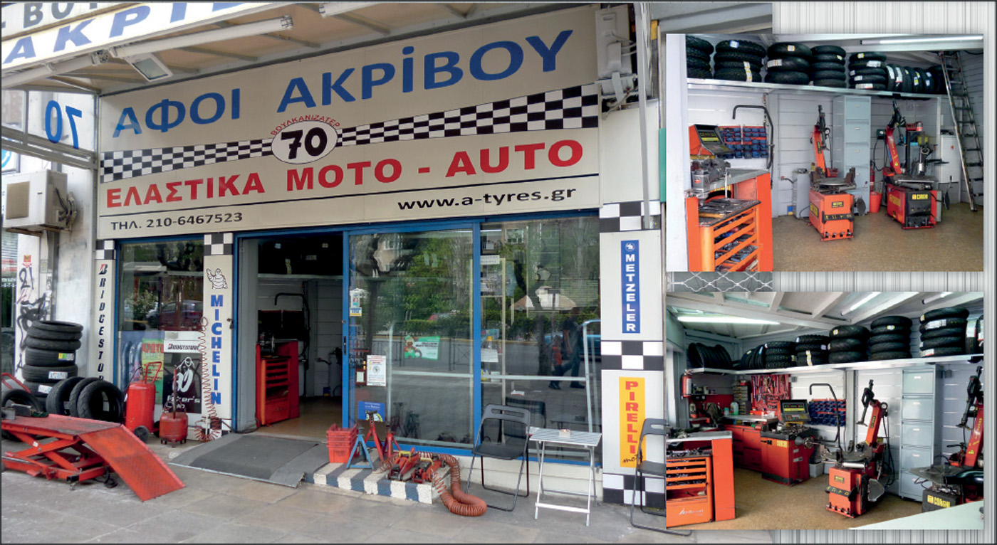 Το κατάστημα Αφοί Ακρίβου & ΣΙΑ ΟΕ βρίσκεται από το 1964 στην Λ. Αλεξάνδρας 70, στο κέντρο της Αθήνας, με ελαστικά για την μοτοσυκλέτα και το αυτοκίνητο στις καλύτερες τιμές της αγοράς. Εκτός από καινούρια ελαστικά στο κατάστημα θα βρείτε και μεταχειρισμένα, όπως και αναλώσιμα για φρένα (Premier & Pro-Race). Επικοινωνήστε με το κατάστημα και επωφεληθείτε από τις μοναδικές προσφορές. Δυνατότητα αποστολής σε όλη την Ελλάδα. Για περισσότερες πληροφορίες www.atyres.gr, τηλ.: 2106467523 ΑΦΟΙ ΑΚΡΙΒΟΥ
