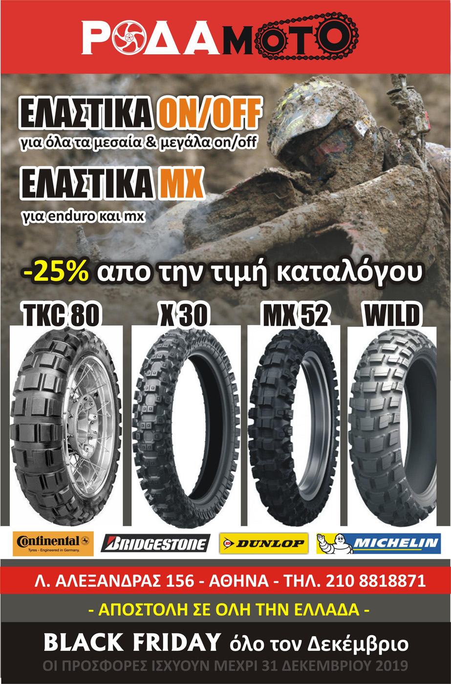 Στο κατάστημα Ρόδα Μότο στη Λ. Αλεξάνδρας 156 θα βρείτε καινούρια ελαστικά για όλα τα μεσαία και μεγάλα ON / OFF, όπως και ελαστικά MX για enduro και mx, με έκπτωση 25% από την τιμή καταλόγου! Ισχύει μέχρι 31 Δεκεμβρίου 2019 και μέχρι εξαντλήσεως των αποθεμάτων. Δυνατότητα αποστολής σε όλη την Ελλάδα. Για να ενημερωθείτε αναλυτικά επικοινωνήστε με το 2108818871 instagram: rodamoto.gr, fb: RodaMoto.gr ΡΟΔΑ ΜΟΤΟ Γ. ΓΟΥΛΑΣ
