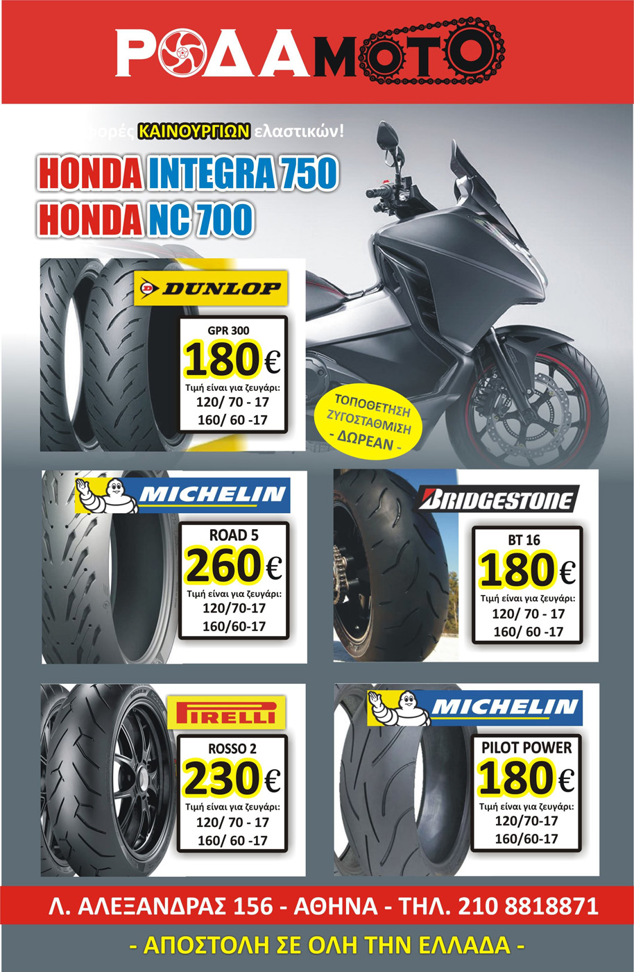 Στο κατάστημα Ρόδα Μότο στη Λ. Αλεξάνδρας 156 θα βρείτε σε προσφορά, καινούρια ελαστικά για τα HONDA INTEGRA 750 / NC 750, με δωρεάν τοποθέτηση και ζυγοστάθμιση! Για να ενημερωθείτε αναλυτικά επικοινωνήστε με το 2108818871 instagram: rodamoto.gr, fb: RodaMoto.gr ΡΟΔΑ ΜΟΤΟ Γ. ΓΟΥΛΑΣ
