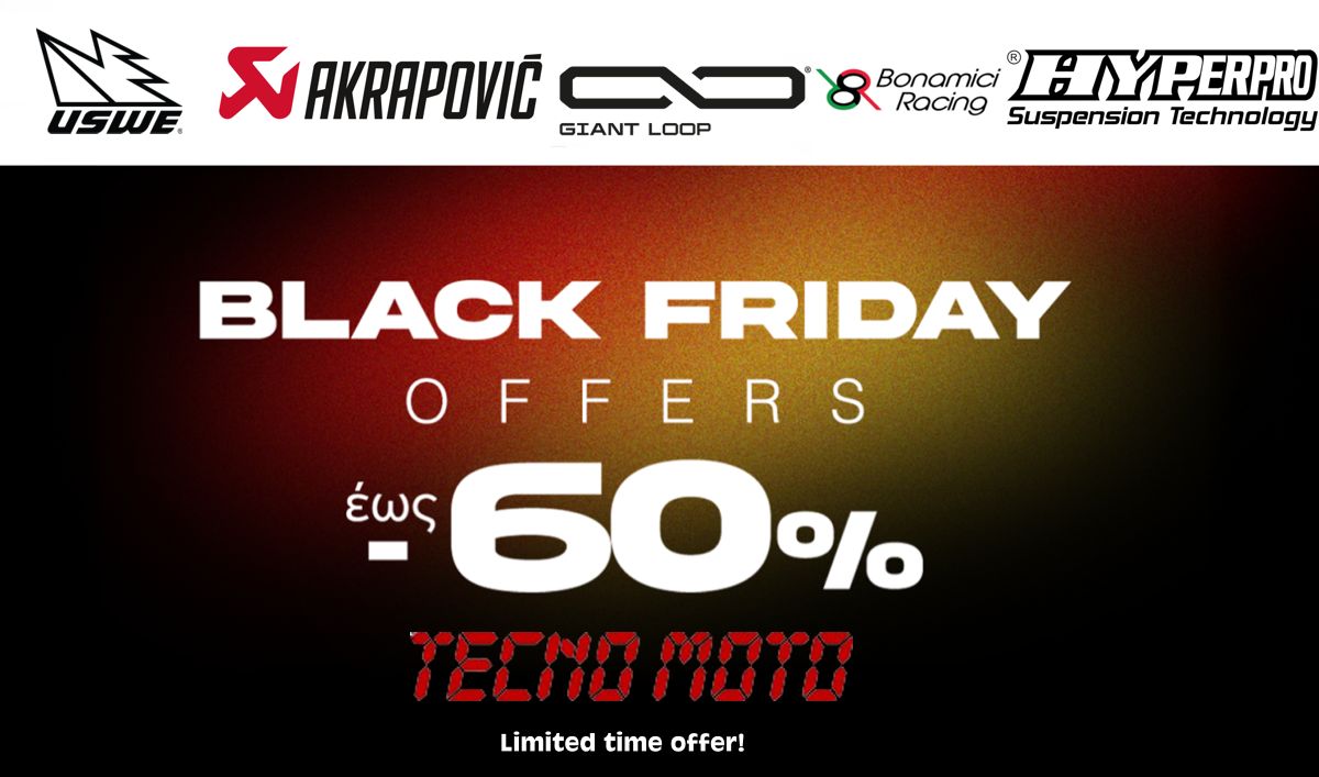 Η Black Friday έφτασε στη Tecnomoto με εκρηκτικές προσφορές! Απόκτησε τώρα επιλεγμένα προϊόντα των κορυφαίων εταιρειών Akrapovic, Giant Loop, Bonamici, USWE και Hyperpro με εκπτώσεις έως 60%. Εξατμίσεις υψηλών επιδόσεων, premium αξεσουάρ αναβάτη, racing λεπτομέρειες και κορυφαίες αναρτήσεις – όλα σε super τιμές! Οι εκπτώσεις ισχύουν για περιορισμένο χρόνο – προλάβετε πριν εξαντληθούν!TECNOMOTO PERFORMANCE