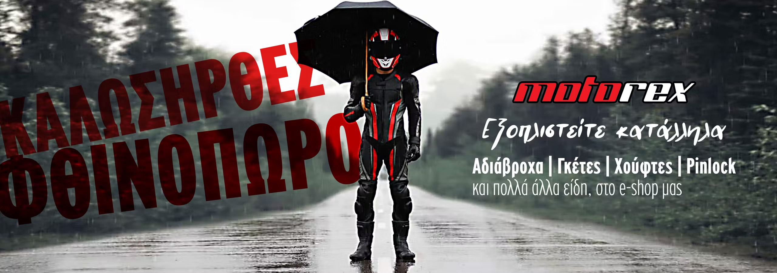 Το φθινόπωρο έφτασε και στο νέο ανανεωμένο eshop του καταστήματος Motorex θα βρείτε αδιάβροχα, γκέτες, χούφτες, Pinlock και ότι ακόμα χρειάζεστε για να εξοπλιστείτε κατάλληλα, ώστε να κυκλοφορείτε με άνεση και ασφάλεια με την μοτοσυκλέτα σας υπό οποιεσδήποτε καιρικές συνθήκες. Για περισσότερες πληροφορίες: www.motorex.gr, Κολοκοτρώνη 51, Πειραιάς, τηλ.: 2104171600 MOTOREX