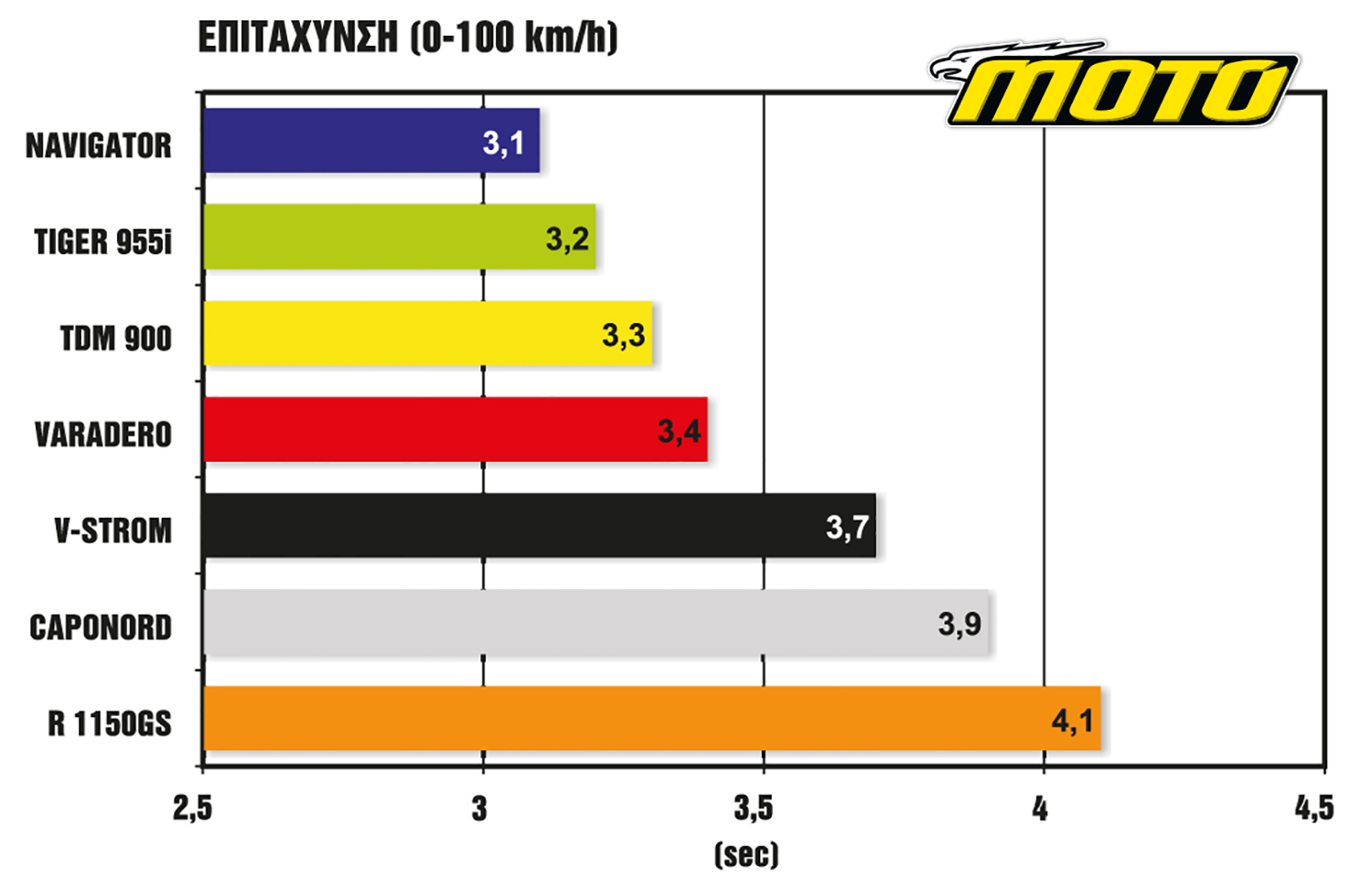 Αν όμως η λύσσα έχει κυριεύσει τον αναβάτη του (πού να δείτε τον Χριστογιάννη με αφρούς…) και βάλει κάτω το κεφάλι, μια ανάσα πάνω από τα όργανα, θα δει το σταμάτημα των αριθμών στο κοντέρ κοντά στα 225 χ.α.ώ. την ίδια στιγμή που όλοι οι υπόλοιποι ανταγωνιστές –πλην του GS– θα απομακρύνονται αργά και σταθερά. Η αλήθεια είναι ότι το TDM αδικείται λόγω του μικρότερου κυβισμού του, και μόλις 10 ίπποι είναι η απόσταση που το χωρίζει από τους υπόλοιπους για να διεκδικήσει υψηλές μουγιέν. Στην επιτάχυνση, όμως, το μικρό του βάρος συντελεί στις καλές επιδόσεις, κάτι που δεν συμβαίνει με το εξίσου "αδύναμο" R 1150GS. Του δικύλινδρου Boxer, και η δύναμη τού λείπει και τα κιλά τού περισσεύουν, και μόνο στον τομέα της προστασίας από τον αέρα καταφέρνει να ανεβεί ένα σκαλί ψηλότερα από το TDM. Όσο αισθητή είναι η γραμμικότητα και προοδευτικότητα στην κατανομή της δύναμης, άλλο τόσο αισθητή είναι και η ανάγκη για περισσότερη διάρκεια ψηλά.
