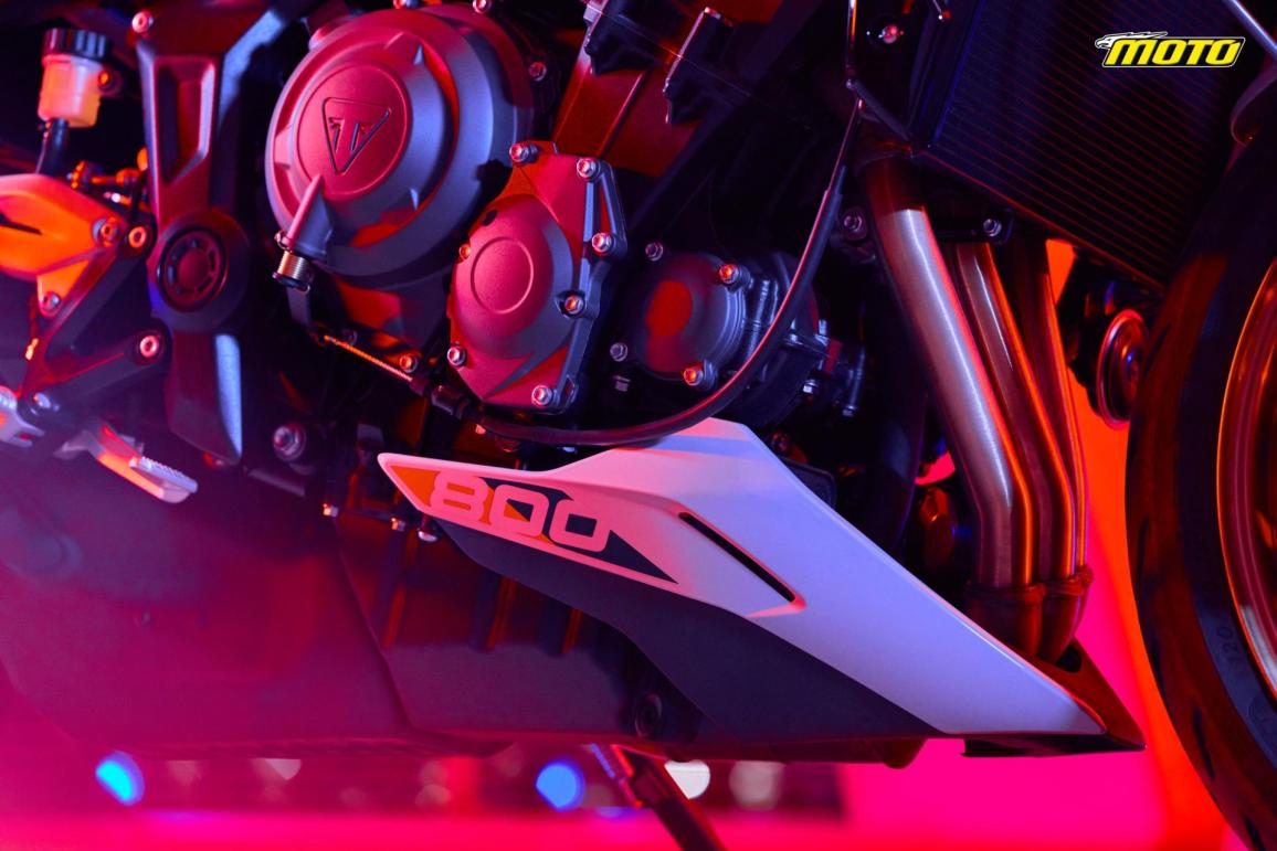 Η βασικότερη διαφορά με το πλαίσιο των 660 είναι στην περιεχόμενη γωνία ώστε να δημιουργηθεί χώρος για την διαφορετική κεφαλή που απαιτεί η τροφοδοσία του 800, με τις υπόλοιπες διαστάσεις του μπλοκ κινητήρα να είναι, όπως είπαμε, αντίστοιχες της μικρότερης έκδοσης. Πολύ μικρή η διαφορά στην κάστερ, μόλις 0,1 μοίρα από το μικρότερο γυμνό που μεγαλώνει όμως το ίχνος για 1mm ενώ ψηλότερα κατά 5mm είναι τοποθετημένος και ο αναβάτης. Όλα αυτά δημιουργούν μία θέση οδήγησης που στο χαρτί από πλευράς αριθμών δεν προϊδεάζει την διαφορά που υπάρχει με την μικρότερη αδερφή της. Αρκετά κοντά και σε αυτό το σημείο με την πρώτη γενιά του Street Triple, με την διαφορά πως έχουμε εδώ ένα καλύτερο σετ αναρτήσεων της Showa.