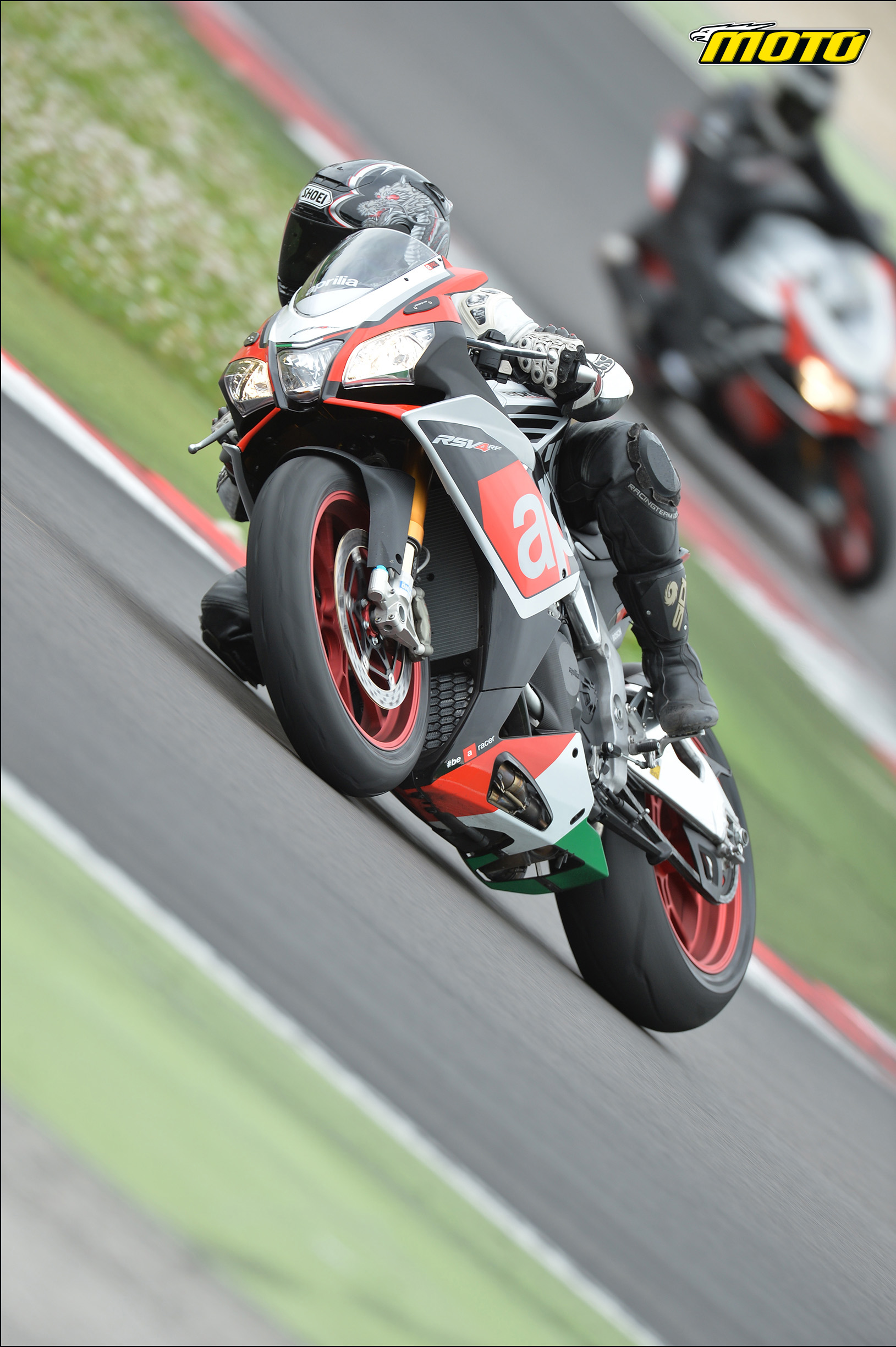 Η νέα γεωμετρία του πλαισίου έφερε πίσω την αίσθηση της πρόσφυσης του εμπρός ελαστικού που είχε χαθεί στο προηγούμενο μοντέλο, το οποίο είχε εκείνο το ειδικό ελαστικό της Pirelli με τον σκληρό σκελετό για να βοηθάει την λειτουργία του traction control. Τώρα όμως χάρη στον νέας γενιάς αισθητήρα επιτάχυνσης πέντε αξόνων, το traction control μπορεί να δουλεύει άψογα με οποιοδήποτε εμπρός ελαστικό. Μιας και μιλάμε για traction control, να πούμε ότι από την θέση 4 έως την 1 επιτρέπει το ντριφτ του πίσω τροχού και είναι οι κατάλληλες ρυθμίσεις για πίστα. Από την θέση 5 έως την 8 αρχίζει και γίνεται ενοχλητικά παρεμβατικό, επεμβαίνοντας στην τροφοδοσία πολύ πριν υπάρξει καν υποψία γλιστρήματος. Το ABS είναι μεν το "αγωνιστικό" της Bosch 9.0MP, όχι όμως το 9.1MP με cornering function που έχει πλέον η Panigale. Στα πρώτα δύο εικοσάλεπτα το είχα ρυθμισμένο στην θέση 1, όπως με συμβούλεψαν οι δοκιμαστές της Aprilia, λέγοντας μου ότι με αυτή την ρύθμιση έκαναν τον ταχύτερο χρόνο. Μπορείς να το απενεργοποιήσεις αν θέλεις, αλλά στο Misano δεν υπάρχει κάποια στροφή που να χρειάζεται πολύ δυνατά φρένα. Μόνο στην πρώτη στροφή που κατεβάζεις από τετάρτη σε δευτέρα, χρειάζεται να σφίξεις με δύναμη την μανέτα, αλλά και πάλι το ABS δεν αμόλησε ποτέ τα φρένα (η αποτροπή ανύψωσης του πίσω τροχού ενεργοποιείται μόνο στις θέσεις 2 και 3) για να χάσω το σημείο εισόδου, οπότε δεν χρειάστηκα να μπω στον κόπο να το απενεργοποιήσω. Από δύναμη και αίσθηση είναι ακριβώς αυτό που περιμένεις από ένα ζευγάρι monoblock τετραπίστονες Brembo με δίσκους 320 χιλιοστών. Δηλαδή είναι άψογα, όμως ο άμεσος ευρωπαϊκός ανταγωνισμός προσφέρει cornering ABS. Για όσους ξέρουν να κινούνται στο όριο της πρόσφυσης των ελαστικών δεν είναι σημαντική διαφορά, όμως για εκείνους που θέλουν να φτάσουν σε αυτό το οδηγικό επίπεδο, είναι.