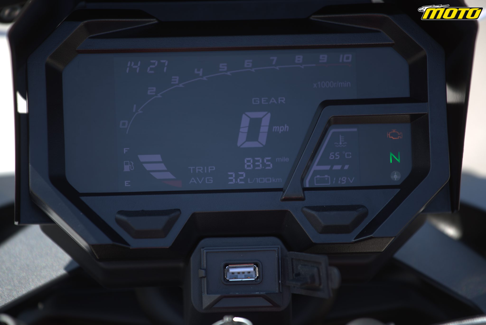 Οθόνη LCD με ενδείξεις για ταχύτητα, στροφές, σχέση κιβωτίου, θήρα USB, φώτα LED εμπρός και πίσω, σχάρα, ρυθμιζόμενη σε ύψος ζελατίνα, ABS