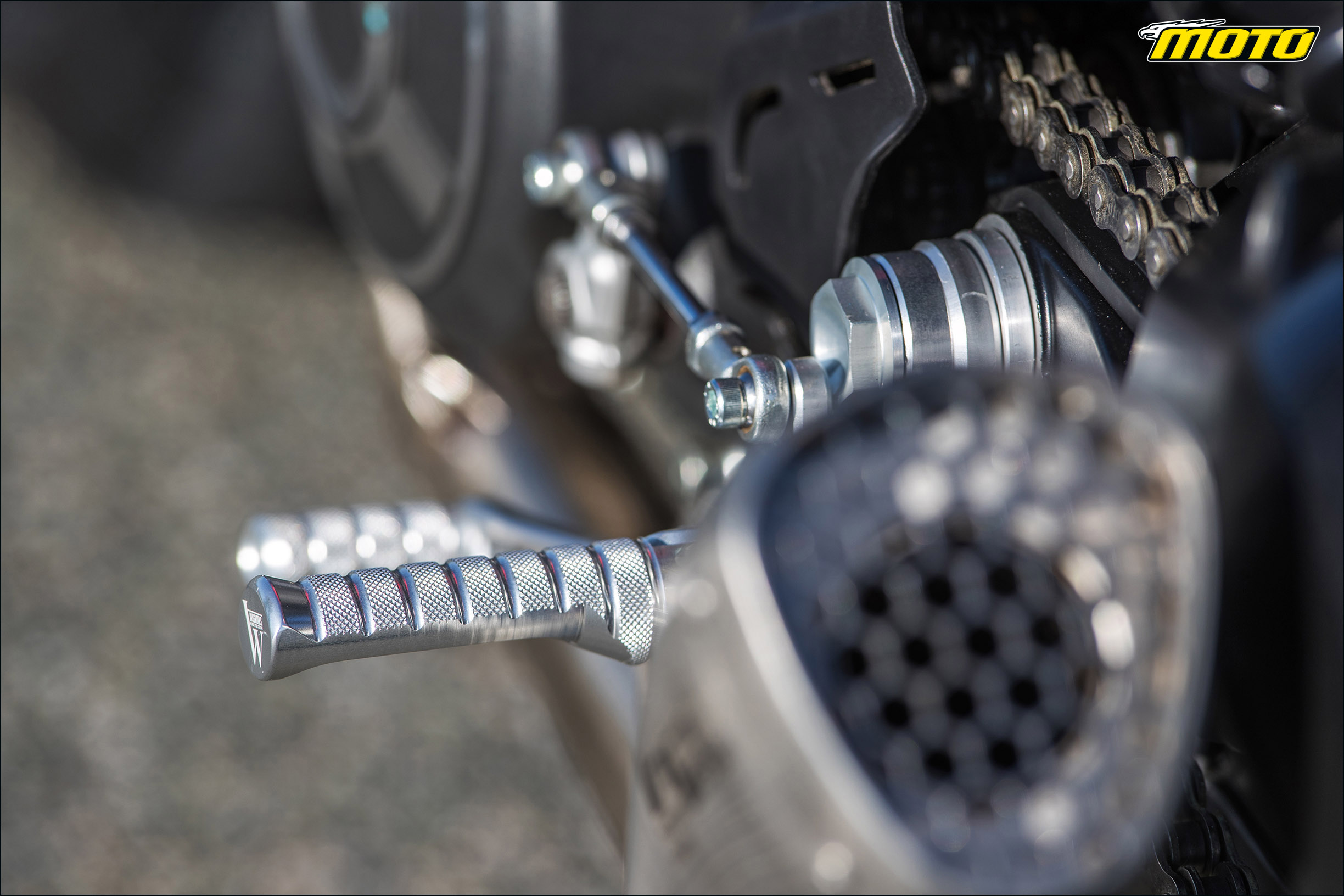 Εξαιρετικά πρόθυμη να βουτήξει στην στροφή, χωρίς όμως απότομες αντιδράσεις, δίχως αναταράξεις από τον πίσω τροχό που δεν έχει ανάρτηση εξ αρχής προσανατολισμένη στην γρήγορη οδήγηση, κι ένα σύνολο εξαιρετικά σταθερό στο άνοιγμα του γκαζιού. Θέλοντας να διατηρήσει την πιστότητα στις Café Racer αλλά και να είναι πάντα μία μοτοσυκλέτα που οδηγείς καθημερινά, ο Πέτρος έκρυψε το πλαϊνό σταντ πίσω από τον αριστερό λαιμό της εξάτμισης και του αφαίρεσε κάθε «αυτί» για να μην το βλέπεις ποτέ, παρά μονάχα όταν με το χέρι το κατεβάσεις για να παρκάρεις την μοτοσυκλέτα. Οι Café Racer, όπως και οι Flat Track, αυτές που οδηγούνταν κάθε ημέρα και αγωνιζόντουσαν τις Κυριακές ταξιδεύοντας οδικώς στις πίστες και όχι σε van, δεν είχαν πλαϊνά σταντ, αλλά έβρισκαν πάντα έναν φιλικό τοίχο. Στην συγκεκριμένη περίπτωση που μπορεί να είναι μία custom που κρύβει πολλές ώρες δουλειάς, αλλά παραμένει και μία καθημερινή μοτοσυκλέτα, το πλαϊνό σταντ δεν μπορούσε να λείπει. Αν βέβαια πιέσεις την μοτοσυκλέτα στις αριστερές στροφές, τότε αρκετά γρήγορα θα αρχίσει να σε εγκαταλείπει γραμμάριο-γραμμάριο, όσο ξύνει δυνατά στην άσφαλτο.