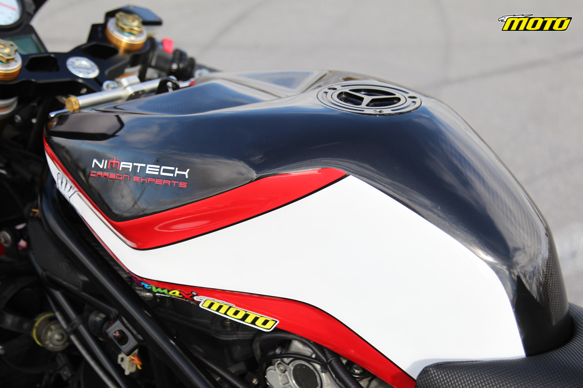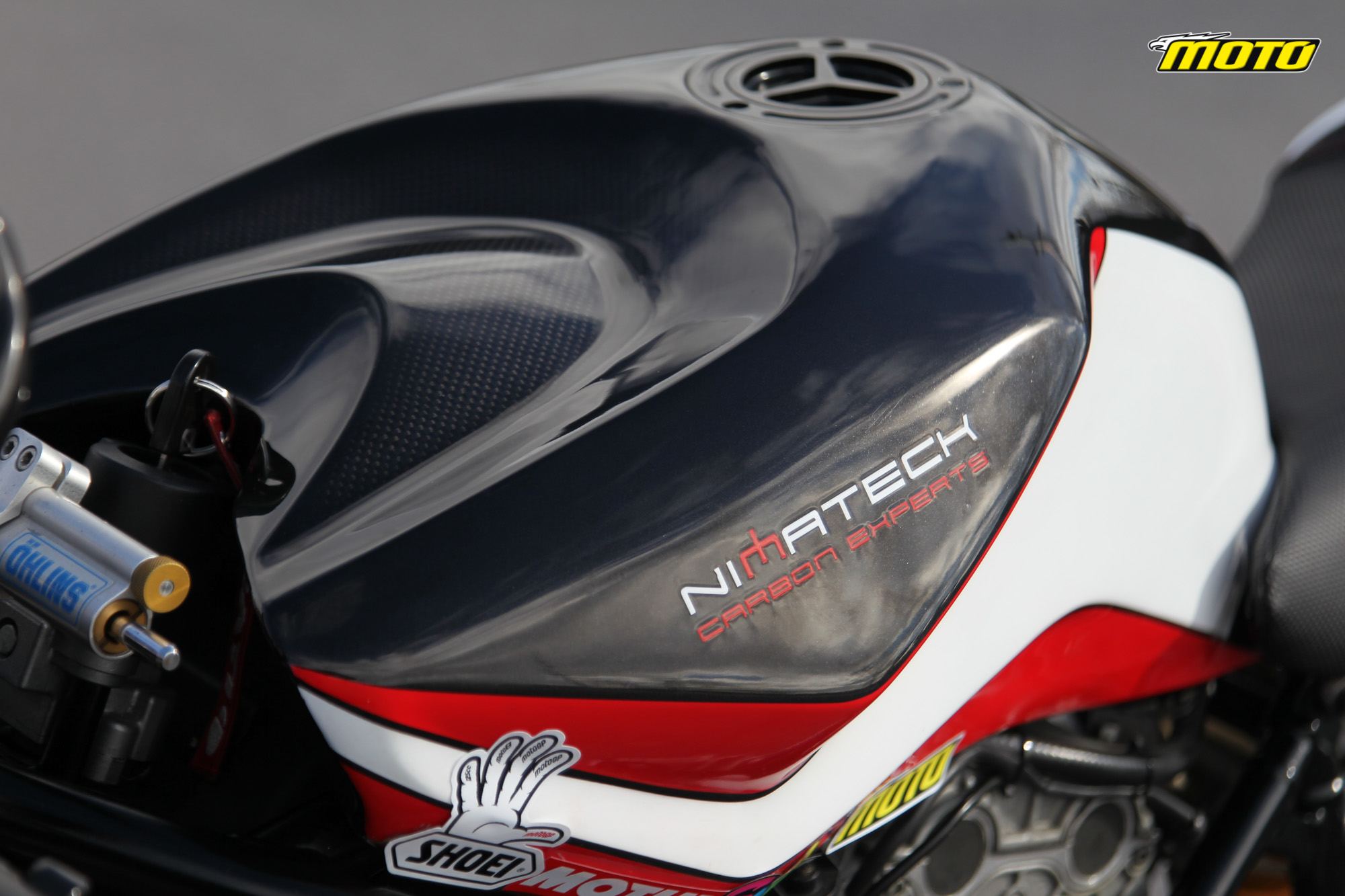 Πάνω σε αυτή τη βάση η Nimateck θέλησε να δημιουργήσει ένα ακόμη πιο απόλυτο superbike δουλεύοντας εκεί που "πονούσε" η μοτοσυκλέτα και υπήρχε πρόσφορο έδαφος: στο βάρος. Η λύση; Μα φυσικά μια από τις ειδικότητες της Nimateck, το ανθρακόνημα. Το carbon fibre είναι το υλικό που κυριαρχεί πάνω στην μοτοσυκλέτα, καθώς αποτελεί την πρώτη ύλη για το ρεζερβουάρ, την ουρά (που είναι μια σμίκρυνση ουράς από 1098) και αυτό κομμάτι που παίζει το ρόλο ενός… μπικίνι φαίρινγκ. Το εξωτικό υλικό, ως γνωστόν, προσφέρει μεγαλύτερη ανθεκτικότητα και πολύ μικρότερο βάρος από τα στάνταρ πλαστικά της μοτοσυκλέτας, αλλά η δίαιτα δεν περιορίστηκε σ' αυτά τα εξαρτήματα.