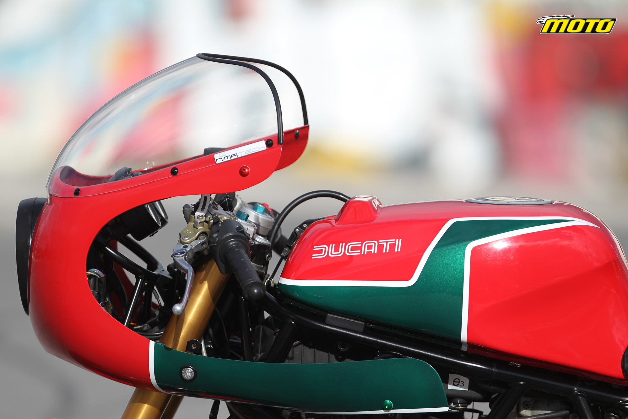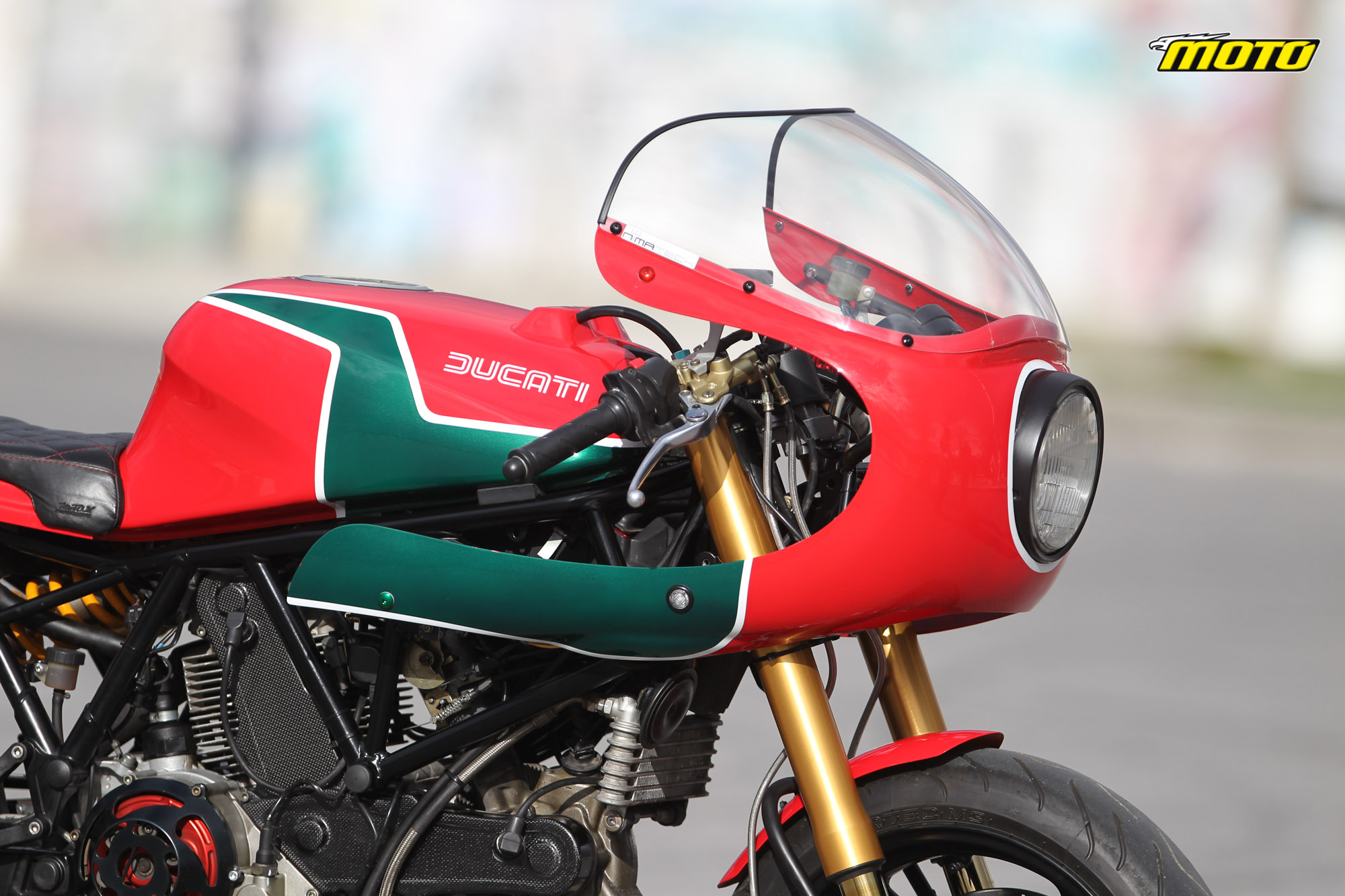 Αυτό οφείλεται στο γεγονός ότι ο ιδιοκτήτης της είναι αρκετά πιο μεγαλόσωμος από οποιονδήποτε Ιταλό δοκιμαστή της Ducati… και η μοτοσυκλέτα έχει προσαρμοστεί για εκείνον. Έτσι, παρά το γεγονός ότι έχει σημαντικά μικρότερο βάρος από τη μοτοσυκλέτα που βασίζεται, ο όγκος της μεγάλης ζελατίνας δημιουργεί την ψευδαίσθηση μιας μεγάλης τουριστικής μοτοσυκλέτας. Tην αρχική εντύπωση ενισχύει η θέση οδήγησης, με τα κλιπ-ον πάνω από την πλάκα του πιρουνιού και τη φαρδιά και χαμηλή σέλα.