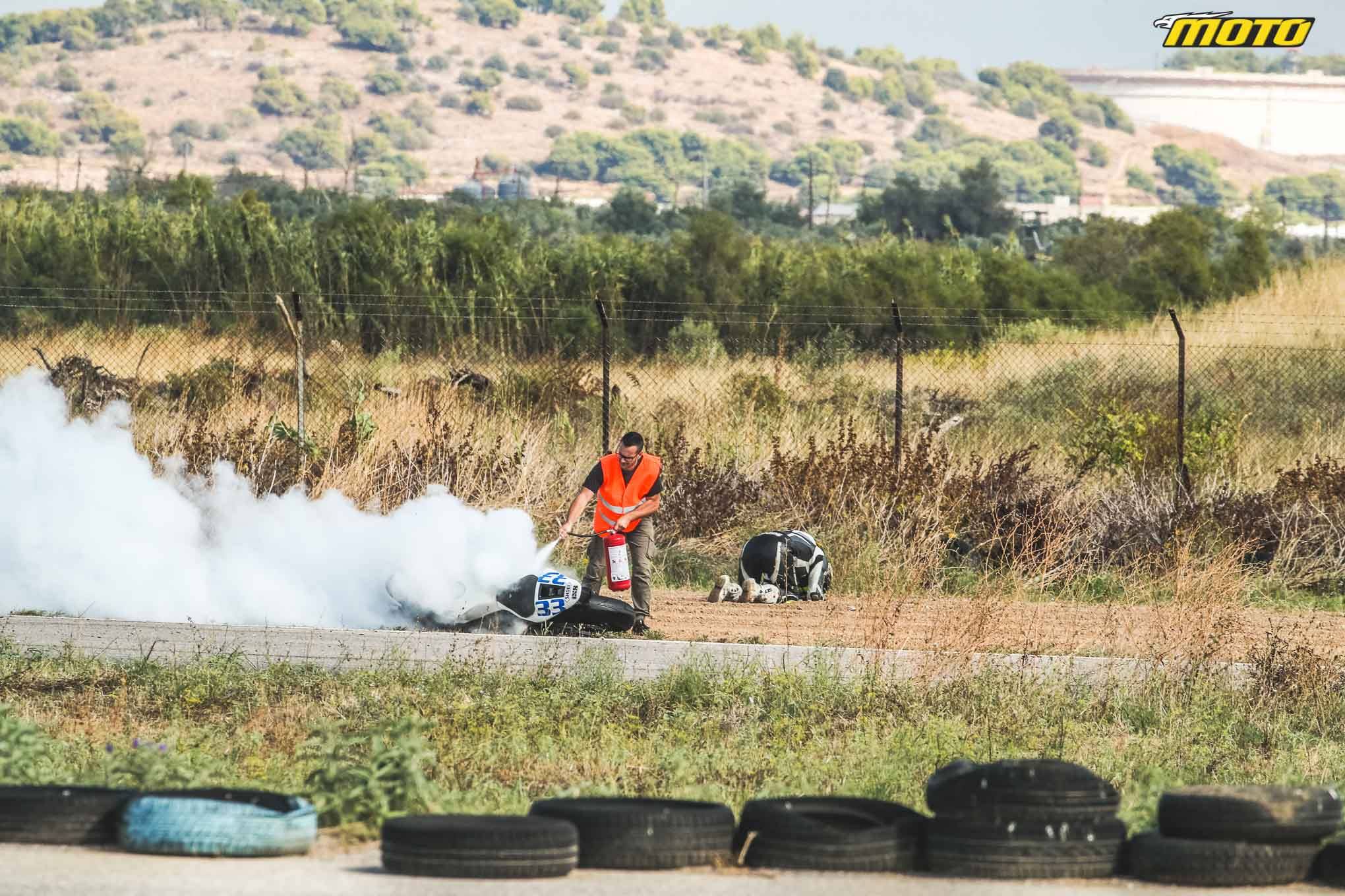 Αυτή την στιγμή στα Μέγαρα επικρατεί προβληματισμός καθώς η πίστα έχει κλείσει. Προηγήθηκε ένα τρομακτικό ατύχημα του αναβάτη με την πλουσιότερη ιστορία, του Γιάννη Τζωρτζόπουλου στην διάρκεια των χρονομετρημένων. Η μοτοσυκλέτα του κ. Τζωρτζόπουλου παρουσίασε πρόβλημα στο τέλος της ευθείας, κι αμέσως μετά σημείωσε πτώση παίρνοντας και φωτιά.