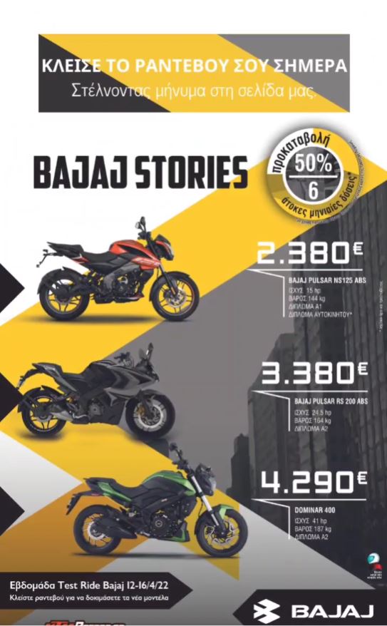Ξεκινούν από σήμερα τα Bajaj Stories στην Πάτρα τα οποία θα διαρκέσουν μέχρι και την Παρασκευή 16 Απριλίου. Οι συμμετέχοντες θα έχουν την δυνατότητα να οδηγήσουν τα μοντέλα της Bajaj Pulsar NS125, Pulsar RS200, Dominar 250 Και Dominar 400.
