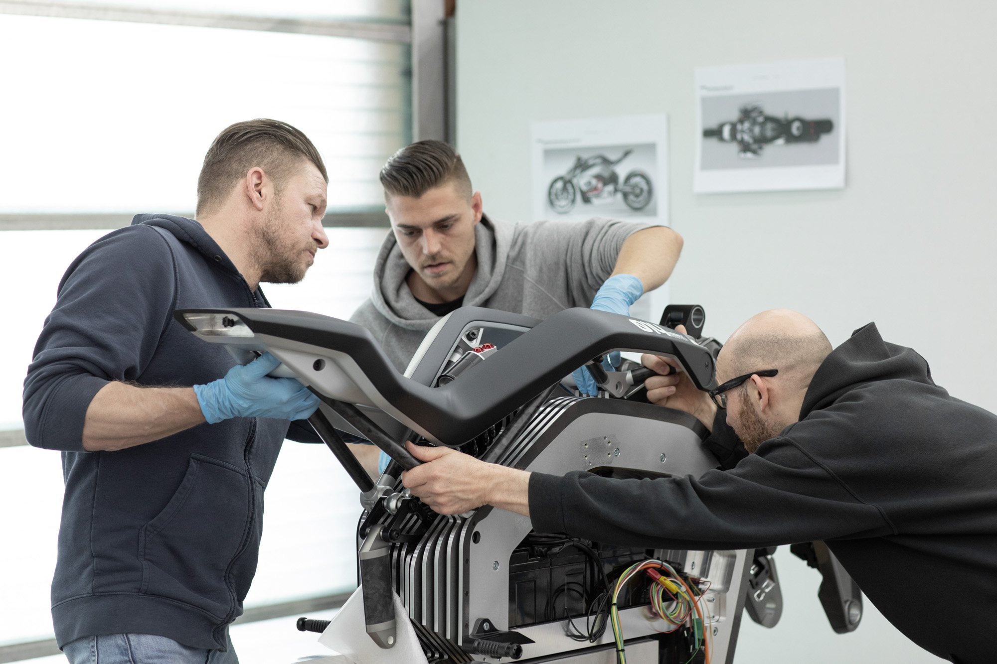 Με σκοπό λοιπόν η BMW να φτιάξει μια ηλεκτρική μοτοσυκλέτα που θα παραμένει κοντά στα σχεδιαστικά πρότυπα των μοτοσυκλετών της με τους boxer κινητήρες, εφάρμοσε μια έξυπνη λύση ώστε να είναι παράλληλα πιο εύπεπτη και οικεία στους αναβάτες, που είναι απ’ τα ένα απ’ τα πιο συντηρητικά κοινά. Εκεί που προεξείχαν οι κύλινδροι του δικύλινδρου boxer, εγκατέστησε δύο βεντιλατέρ που στέλνουν φρέσκο αέρα στην καρδιά της ηλεκτρικής μοτοσυκλέτας ώστε να την ψύχουν καλύτερα και συνδέονται με αυτή μέσω σωλήνων. Τόσο ο κινητήρας όσο και οι μπαταρίες βρίσκονται κάτω απ’ τη σέλα του αναβάτη και πλαισιώνονται από ένα αλουμινένιο κουτί με ψύκτρες. Μάλιστα, το κουτί αποτελεί το πλαίσιο της μοτοσυκλέτας που πάνω του δένουν τα επιμέρους εξαρτήματα της μοτοσυκλέτας.