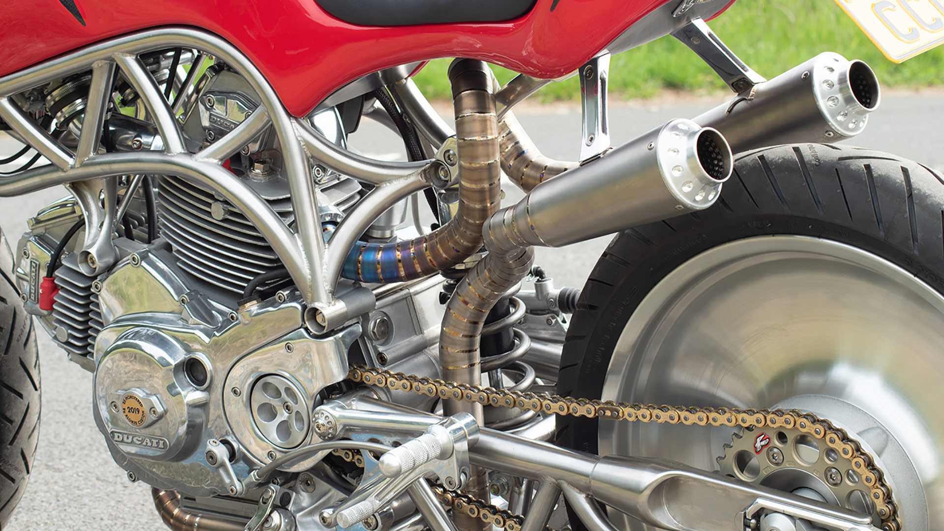 Η πιο πρόσφατη δημιουργία της είναι αυτή η Ducati, που όταν μπήκε στο γκαράζ της ήταν μια συνηθισμένη Monster 600 και σε πολύ μέτρια κατάσταση μάλιστα. Το πρώτο βήμα ήταν να λυθεί όλος ο κινητήρας και να ανακατασκευαστεί πλήρως, ενώ όλα τα υπόλοιπα εξαρτήματα πέραν του αμορτισέρ έμειναν στην άκρη. Για τη δημιουργία του πλαισίου, ο σχεδιασμός του έγινε πρώτα στο CAD (σχεδιαστικό πρόγραμμα υπολογιστή). Με μια πιο προσεκτική ματιά γίνεται αντιληπτό πως διαθέτει περισσότερες ενισχύσεις μεταξύ των δυο βασικών σωλήνων, οι οποίες έχουν αντίθετη φορά απ’ ότι είχαν αυτές του αρχικού. Το πιρούνι έχει αντικατασταθεί με ένα χειροποίητο girder που ακολουθεί την ίδια φιλοσοφία καθώς είναι ιδιαίτερα καμπυλωτό συγκριτικά με αυτά που βλέπουμε συνήθως. Αντίστοιχα και το ψαλίδι είναι όλο φτιαγμένο στο χέρι και σχεδιασμένο με τον ίδιο τρόπο, με αποτέλεσμα τα εξαρτήματα που πλαισιώνουν τον κινητήρα να απορρέουν την αίσθηση της ρευστότητας του συνόλου.