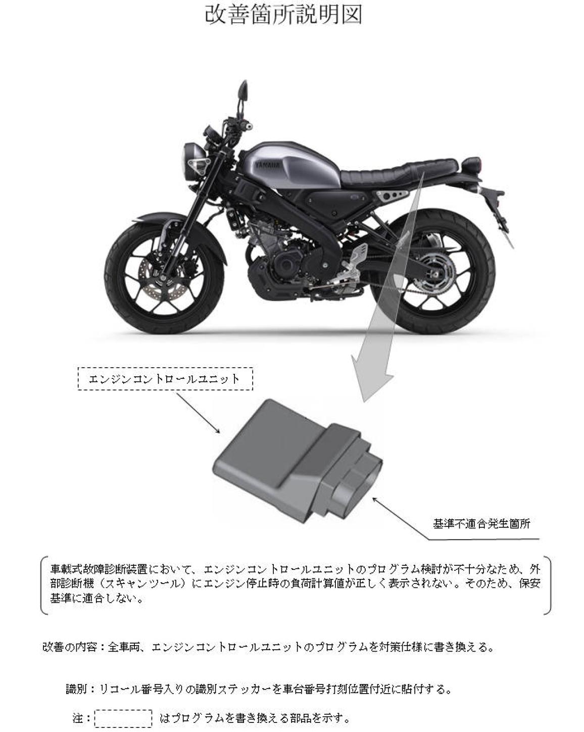 Συνεχίζουμε με την ανάκληση που αφορά στα XSR125, YZF-R125, MT-125, και YZF-R15. Αυτή αφορά στη διαγνωστική μονάδα της ECU, η οποία δεν πληροί τις απαιτούμενες τεχνικές προδιαγραφές και δεν δίνει τα σωστά στοιχεία στον τεχνικό έλεγχο που πραγματοποιείται στους dealer. Η Yamaha αναφέρει πως όλες οι επηρεαζόμενες ECU θα “φλασαριστούν” / επαναπρογραμματιστούν ώστε να δίνουν τα σωστά στοιχεία.