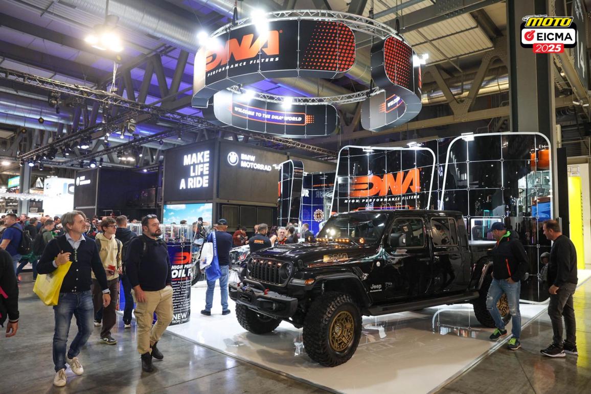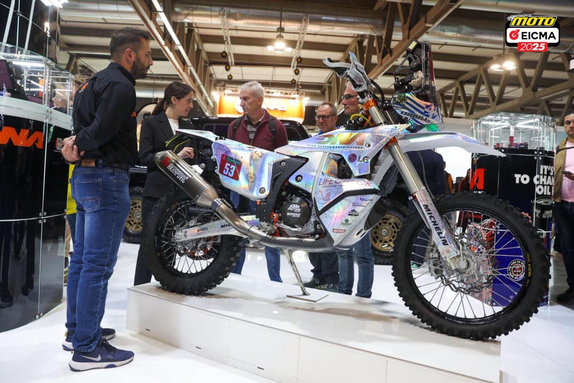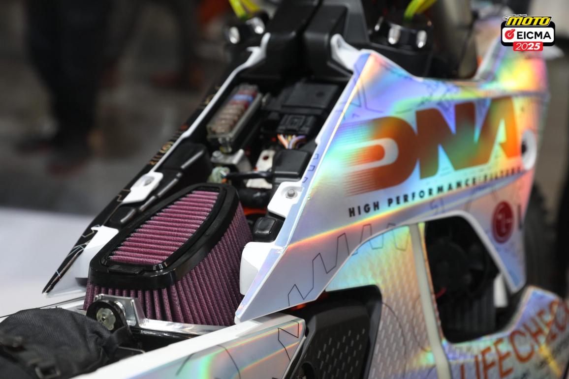 Στο περίπτερο της DNA στο Μιλάνο οι επισκέπτες μπορούν να θαυμάσουν από κοντά την KTM 450 Rally Replica με την οποία θα συμμετέχει ο Βασίλης Μπούδρος στο Rally Dakar 2026 με την ελληνική εταιρεία φίλτρων να είναι ο μεγάλος του χορηγός (περισσότερα εδώ).