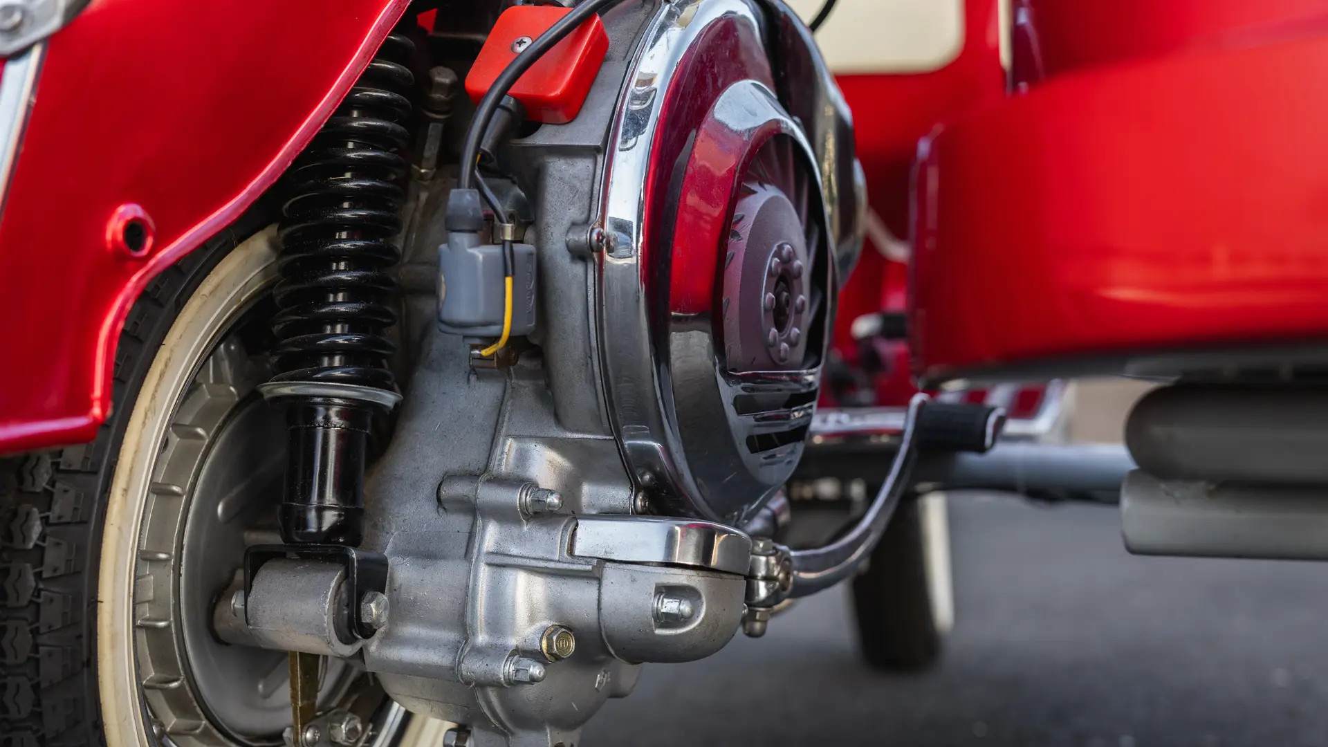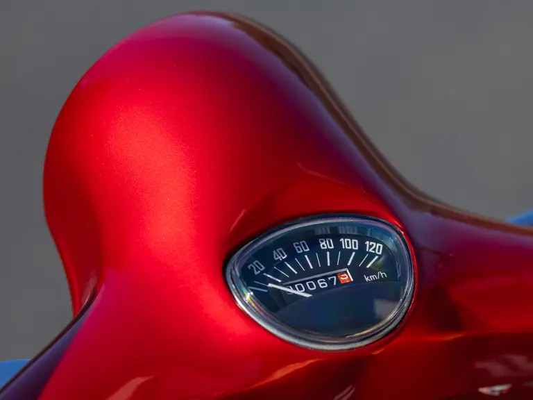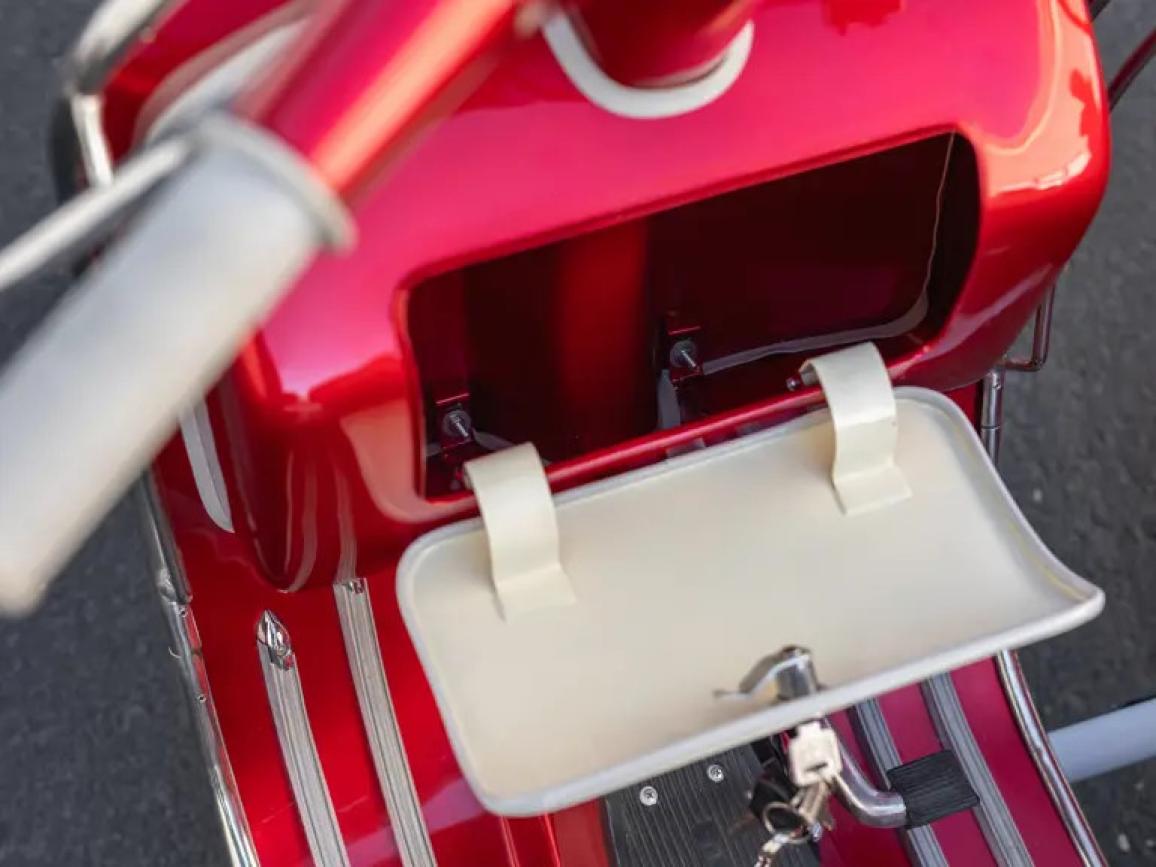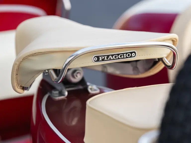 Η δίχρωμη βαφή του μοντέλου που δημοπρατείται σε κόκκινο και λευκό χρώμα της Vespa δίνει στο σκούτερ μια εμφάνιση που ταιριάζει στην εποχή, ενώ το Sidecar σε συνδυασμό με την διπλή σέλα, μπορεί να μετακινήσεις τρία άτομα στο σύνολο!