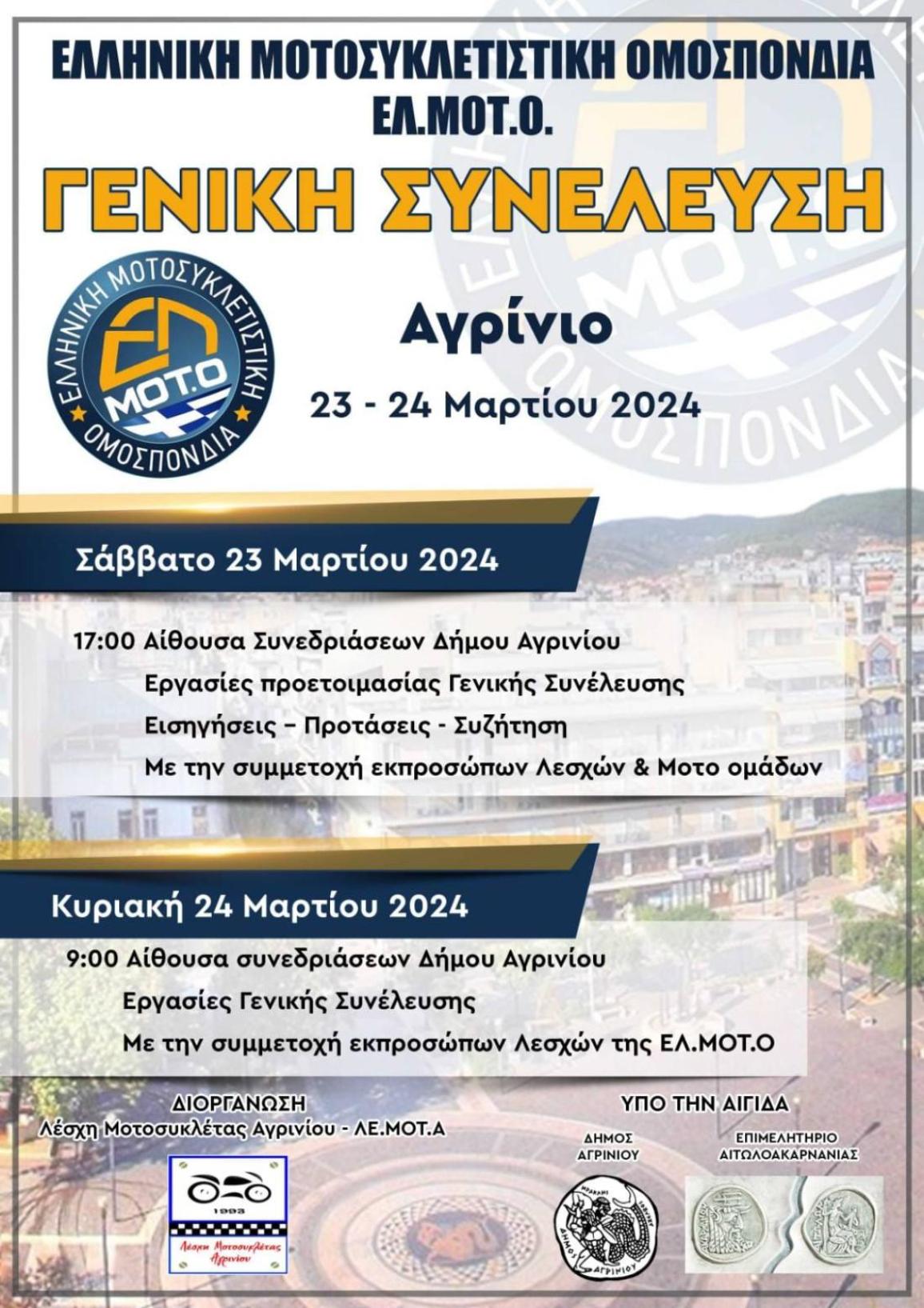 Η Ελληνική Μοτοσυκλετιστική Ομοσπονδία ανακοίνωσε τη διεξαγωγή Γενικής Συνέλευσης το Σαββατοκύριακο 23-24/3, οργανωτής της οποίας είναι η Λέσχη Μοτοσυκλέτας Αγρινίου, ενώ η είσοδος είναι ανοικτή για όλους.