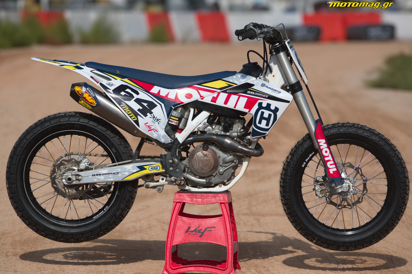 Χαμηλωμένη και με το τιμόνι της Pro Taper (μοντέλο EVO) που έχει ειδικό σχεδιασμό για να δημιουργηθεί μια σωστά εργονομικά θέση οδήγησης για Flat Track, η Husqvarna FC 450 ήταν έτοιμη να μπει στην πίστα. Αν κάτι της έλειπε, αυτό ήταν η αλλαγή της αισθητικής, όμως χάρη στην DXL Graphics που ανέλαβε τον σχεδιασμό και την κατασκευή ενός σετ αυτοκόλλητων, η FC 450 δείχνει πλέον σαν να είναι μοτοσυκλέτα εργοστασιακής ομάδας! Πραγματικά φοβερή δουλειά σε ποιότητα υλικών και εκτύπωσης από την DXL Graphics.