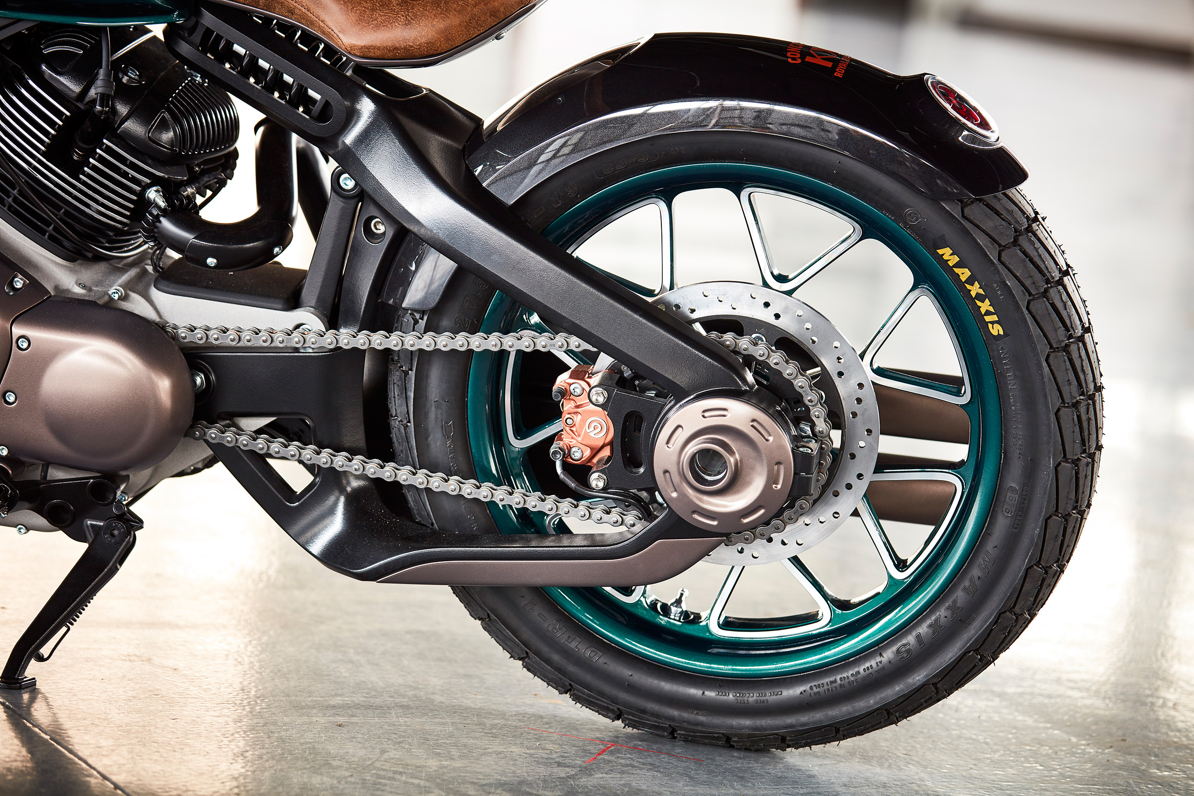 Βέβαια το πίσω σύστημα της ανάρτησης και του μονόμπρατσου ψαλιδιού μόνο απαρατήρητο δεν περνά, με την ανάρτηση να δίνει την οπτική αίσθηση πως είναι φυτευτή μέσα στο ψαλίδι, ενώ ο τρόπος που δένει το ψαλίδι με τον κινητήρα και το μοχλικό, κεντρίζουν ιδιαίτερα το ενδιαφέρον. Οι ζάντες απ’ την άλλη είναι κατασκευασμένες σε CNC εργαλειομηχανή, με την πράσινη βαφή να ολοκληρώνει εξαίσια το αποτέλεσμα. Με την νέα KX –έστω και σε concept μορφή- η Royal Enfield απέδειξε στην EICMA τις δυνατότητές της να αναβιώσει ιστορικά μοντέλα αλλά και την δύναμη που έχει αποκτήσει, δηλώνοντας πολλά υποσχόμενη για την πορεία της στην παγκόσμια αγορά.