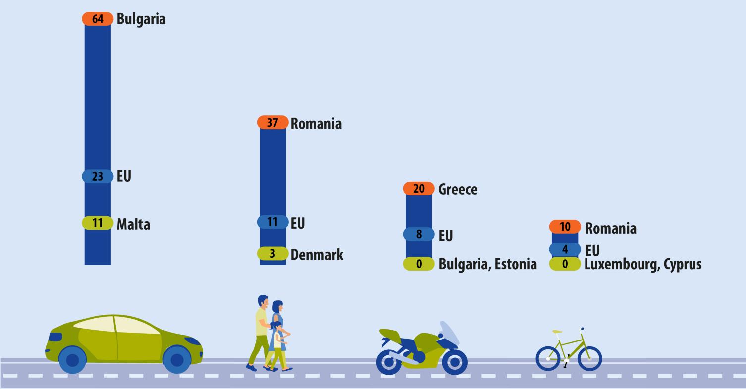 Έτσι, στα στατιστικά στοιχεία που παρουσιάστηκαν, οι Βούλγαροι σκοτώνονται σαν τις μύγες με τα αυτοκίνητα, έχοντας 64 θανάτους σε τροχαία ανά ένα εκατομμύριο κατοίκους. Την ίδια στιγμή όμως (σύμφωνα με τα στοιχεία της Eurostat) οι Βούλγαροι είναι οι καλύτεροι και προσεκτικότεροι μοτοσυκλετιστές στην Ε.Ε. (!) μιας και εμφανίζονται με μηδενικά θανατηφόρα στην συγκεκριμένη κατηγορία. ένα ενδεικτικό παράδειγμα του πόσο προσεκτικοί πρέπει να είναι όσι πάνε να ερμηνεύσουν τα στοιχεία από την Eurostat φαίνεται και στο γεγονός πως η Ρουμανία είναι πρώτη στα θανατηφόρα ατυχήματα με πεζούς και ποδήλατα. Γιατί είναι πρώτη η Ρουμανία; Διότι οι άνθρωποι εκεί είναι φτωχοί (έχει και πάρα πολλούς Ρομά…) και μετακινούνται με τα πόδια ή τα ποδήλατα. Την ίδια στιγμή (σύμφωνα με την έκθεση της Eurostat) οι Ρουμάνοι οδηγοί αυτοκινήτων και μοτοσυκλετών είναι από τους καλύτερους οδηγούς στον κόσμο!!!