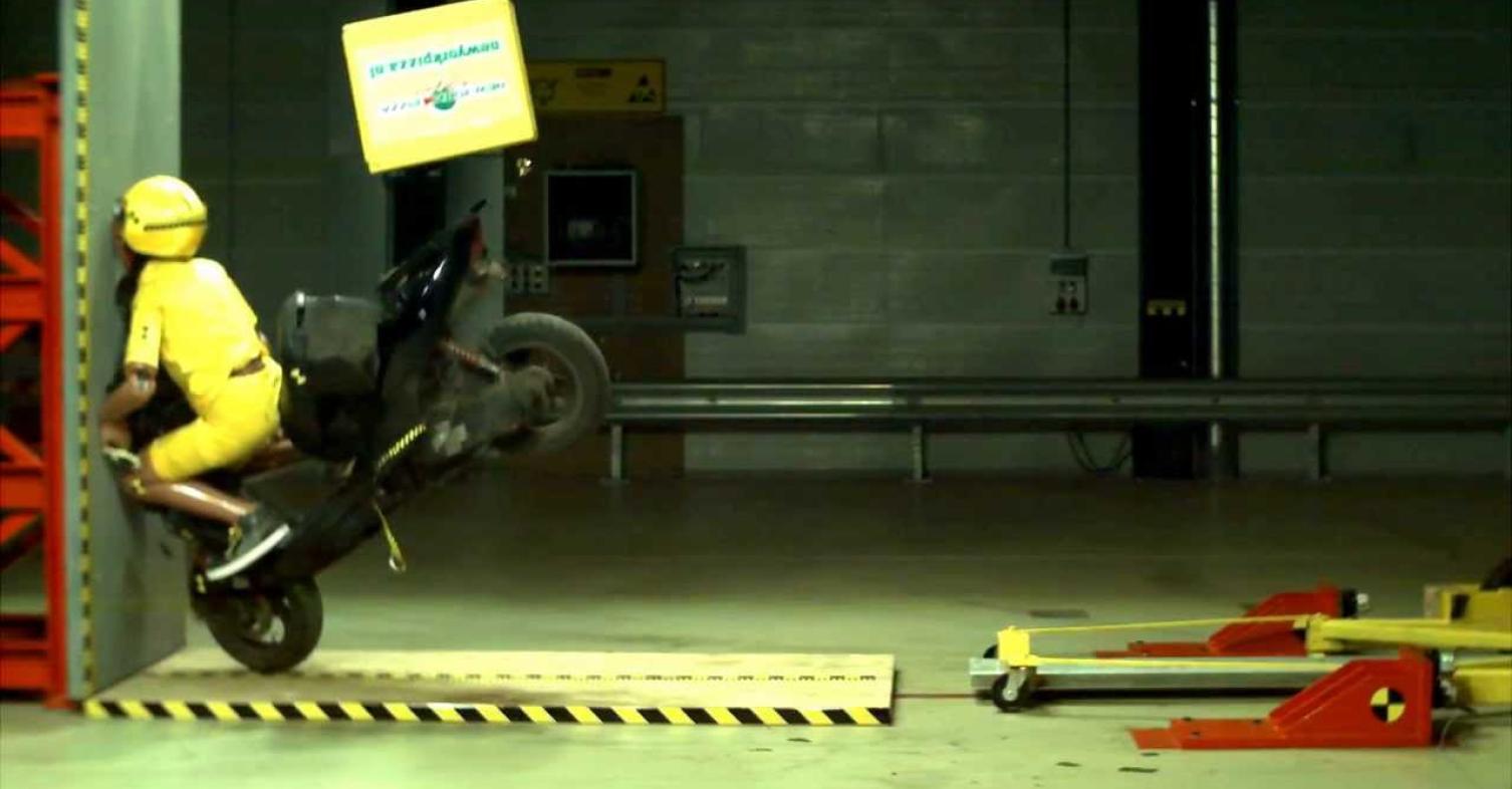 Αυτό το βιντεάκι σε αργή κίνηση μας δείχνει τι ακριβώς γίνεται όταν ένα scooter πέφτει πάνω σε τοίχο με ταχύτητα μικρότερη των 50km/h. Προσέξτε τους καρπούς των χεριών της κούκλας και θα καταλάβετε γιατί οι περισσότεροι τραυματισμοί όταν έχουμε ατύχημα στο δρόμο, πέφτοντας πάνω σε μεγάλα αντικείμενα (π.χ. αυτοκίνητα…) είναι σπασμένα χέρια. Επίσης θα θέλαμε να ρίξετε και μια ματιά στην προστασία που προσφέρουν τα ανοιχτά κράνη σε περιπτώσεις μετωπικών συγκρούσεων… Κι αν μετά από αυτό το video πιστεύει ακόμα κάποιος ότι αν “δεν τρέχει” είναι απόλυτα ασφαλής να κυκλοφορεί χωρίς κράνος, τότε τι άλλο να του δείξεις για να το πείσεις;
