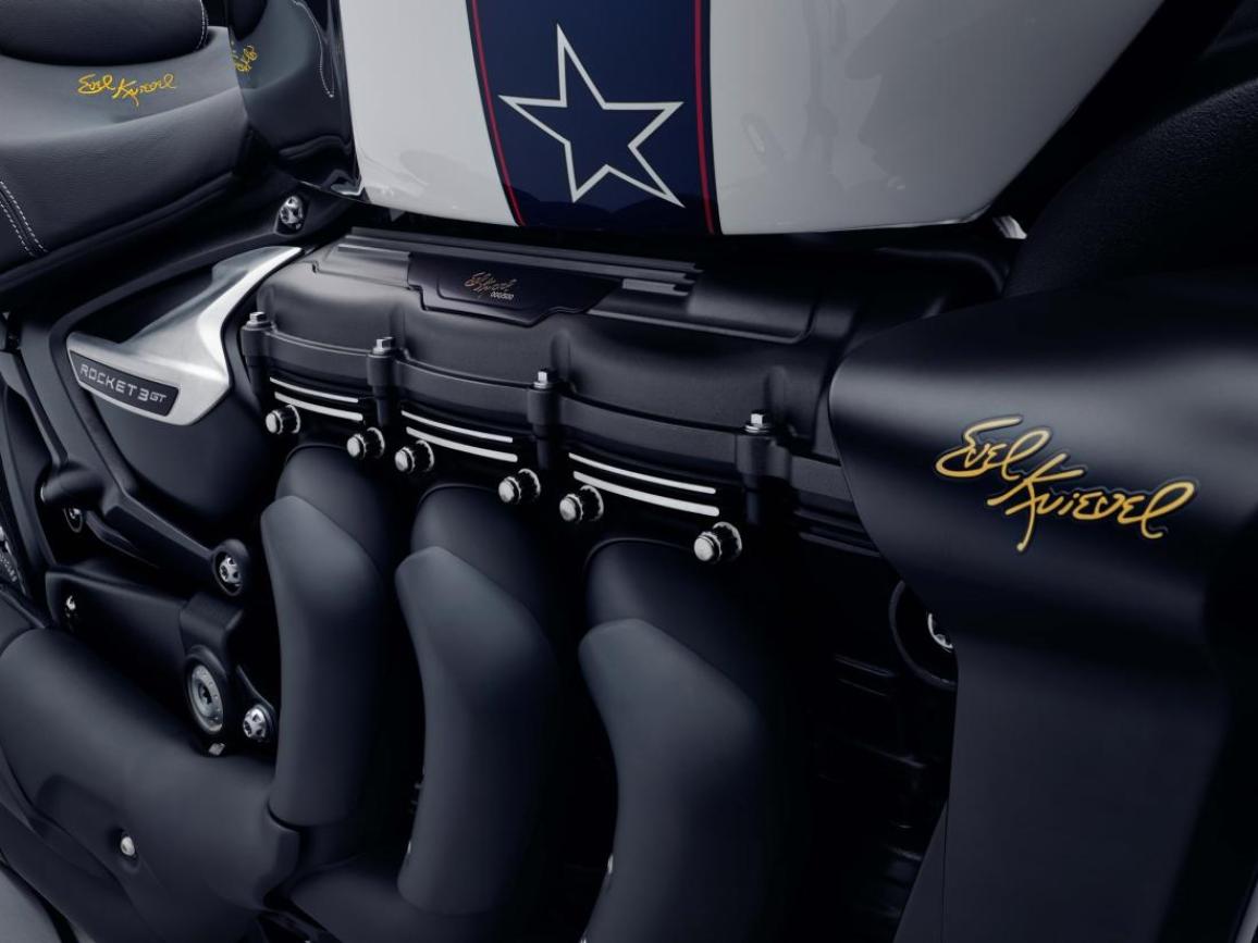 Η σχέση μεταξύ Triumph και Knievel ξεκίνησε από την πρώτη κιόλας τηλεοπτική εμφάνιση του θεότρελου Αμερικανού, όπου οδηγούσε ένα Bonneville T120, μέχρι και το άλμα που είχε κάνει στο καζίνο και ξενοδοχείο Caesars Palace στο Las Vegas, πηδώντας πάνω από τα σιντριβάνια. Όπως προείπαμε οι διαφορές των συγκεκριμένων Rocket 3  είναι μόνο στιλιστικές, με την απόδοση του κτηνώδους τρικύλινδρου κινητήρα των 2.500 cc να παραμένει ίδια, με την εντυπωσιακή ροπή των 22,94 kgm (!) στις 4.000σ.α.λ. και με 182 ίππους στις 7.000 στροφές ανά λεπτό.