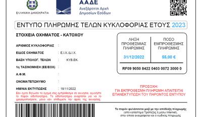 Επικαιρότητα 18/11/2022 Τέλη Κυκλοφορίας 2023 - Αναρτήθηκαν τα ειδοποιητήρια Τα ειδοποιητήρια για τα τέλη κυκλοφορίας του 2023 αναρτήθηκαν στην πλατφόρμα myCar της ΑΑΔΕ, όπου μπ...