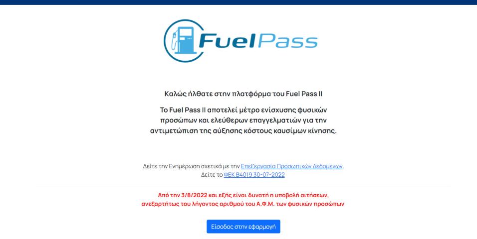 Επικαιρότητα 3/8/2022 Fuel Pass II - Ανοιχτή η πλατφόρμα από τις 3 Αυγούστου 2022 για όλα τα ΑΦΜ Από σήμερα 3/8/2022 και στο εξής είναι δυνατή η υποβολή αιτήσεων για το επίδομα ενίσχυσης Fuel Pass II που αφορά στα καύσιμα κίνησης, ανεξαρτήτως του λήγοντος αριθμού του Α.Φ.Μ. των φυσικών προσώ...