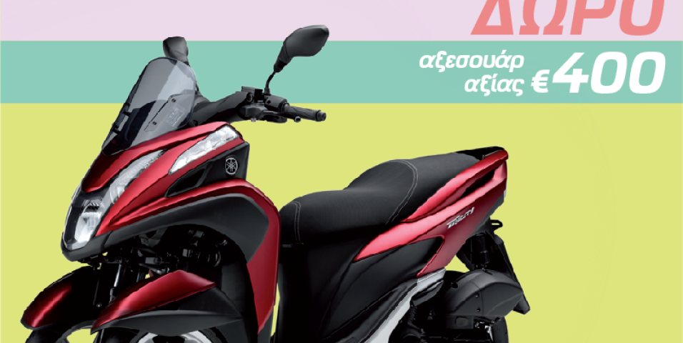 Επικαιρότητα 23/3/2016 Απολαύστε την ευελιξία και σιγουριά ενός Yamaha Tricity με δώρο γνήσια αξεσουάρ αξίας €400! Με την αγορά κάθε Yamaha Tricity 125 έως το τέλος Απριλίου, κάθε πελάτης παίρνει δώρο γνήσια αξεσουάρ bolt-on συνολικής αξίας €400. H επιλογή γίνεται ανάμεσα σε 2 «πακέτα» γνήσιων αξεσουάρ, τα οπ...