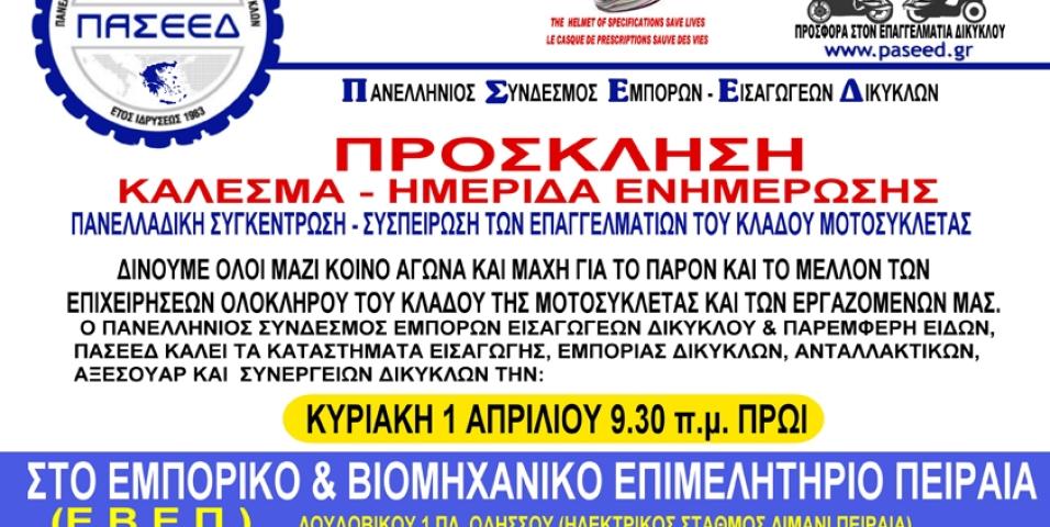 Επικαιρότητα 28/3/2012 Ημερίδα ΠΑΣΕΕΔ την 1η Απρίλη Ο Πανελλήνιος Σύνδεσμος Εμπόρων Εισαγωγέων Δικύκλων & συναφή επαγγελμάτων, καλεί τα μέλη του και όλους τους επαγγελματίες του κλάδου (καταστήματα εμπορίας μοτοσυκλετών, ανταλλακτικών, αξεσουάρ κ.α...
