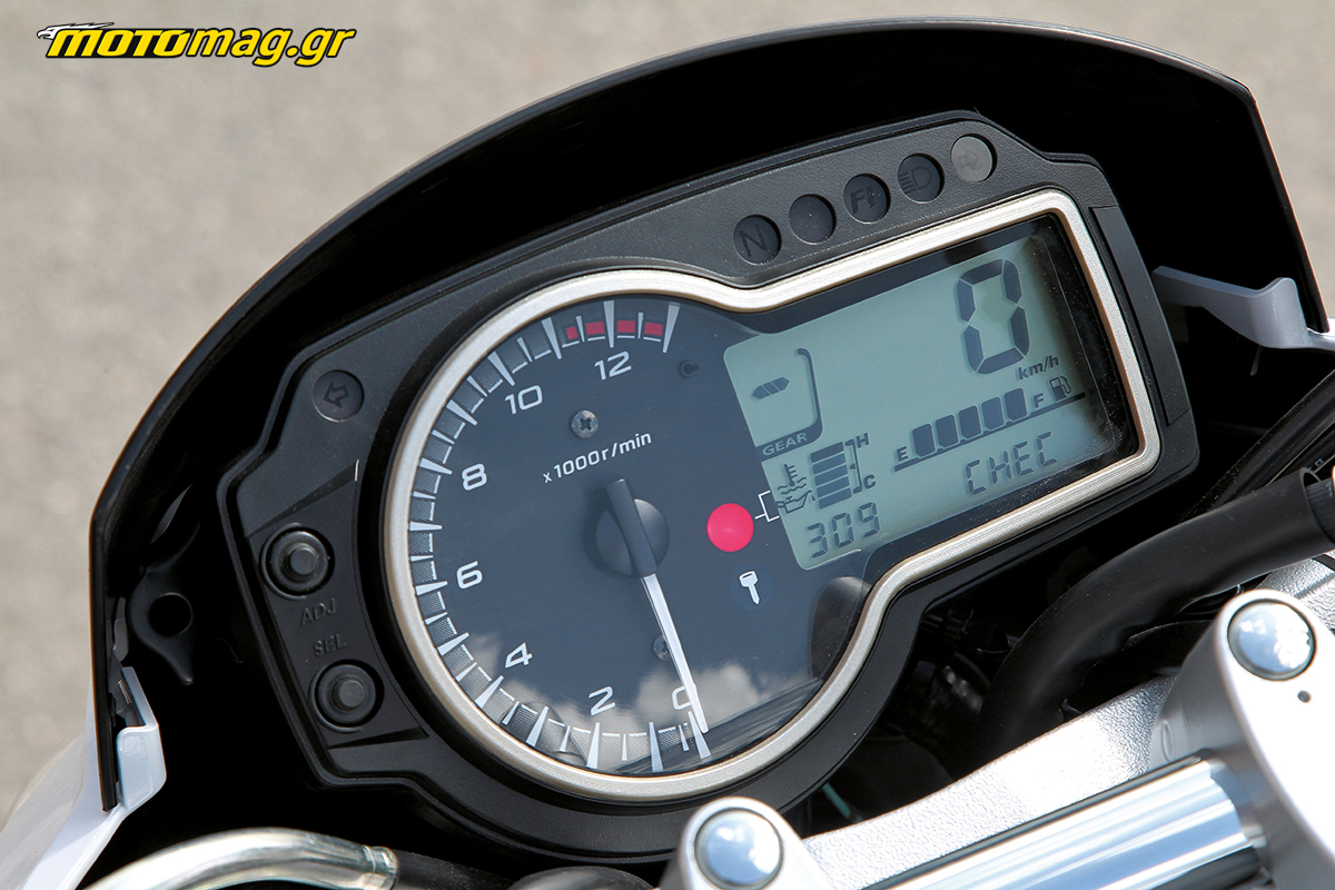 Ταχύμετρο, στροφόμετρο, δείκτης βενζίνης, ένας ολικός και δύο μερικοί χιλιομετρητές, ένδειξη μέσης κατανάλωσης, επιλεγμένη σχέση κιβωτίου