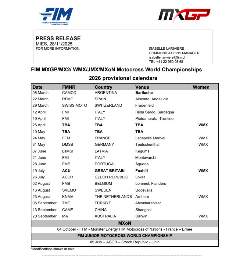 Η σεζόν του 2026 θα ξεκινήσει επίσημα στις 7–8 Μαρτίου, με το MXGP της Αργεντινής να επιστρέφει στη θεαματική περιοχή της Παταγονίας, στη νέα παραλίμνια πίστα του Bariloche. Ο αγώνας θα αποτελέσει τον εναρκτήριο γύρο του πρωταθλήματος, προσφέροντας στο κοινό ένα εκπληκτικό τοπίο και μια μοναδική ατμόσφαιρα για την εκκίνηση των πρωταθλημάτων MXGP και MX2.