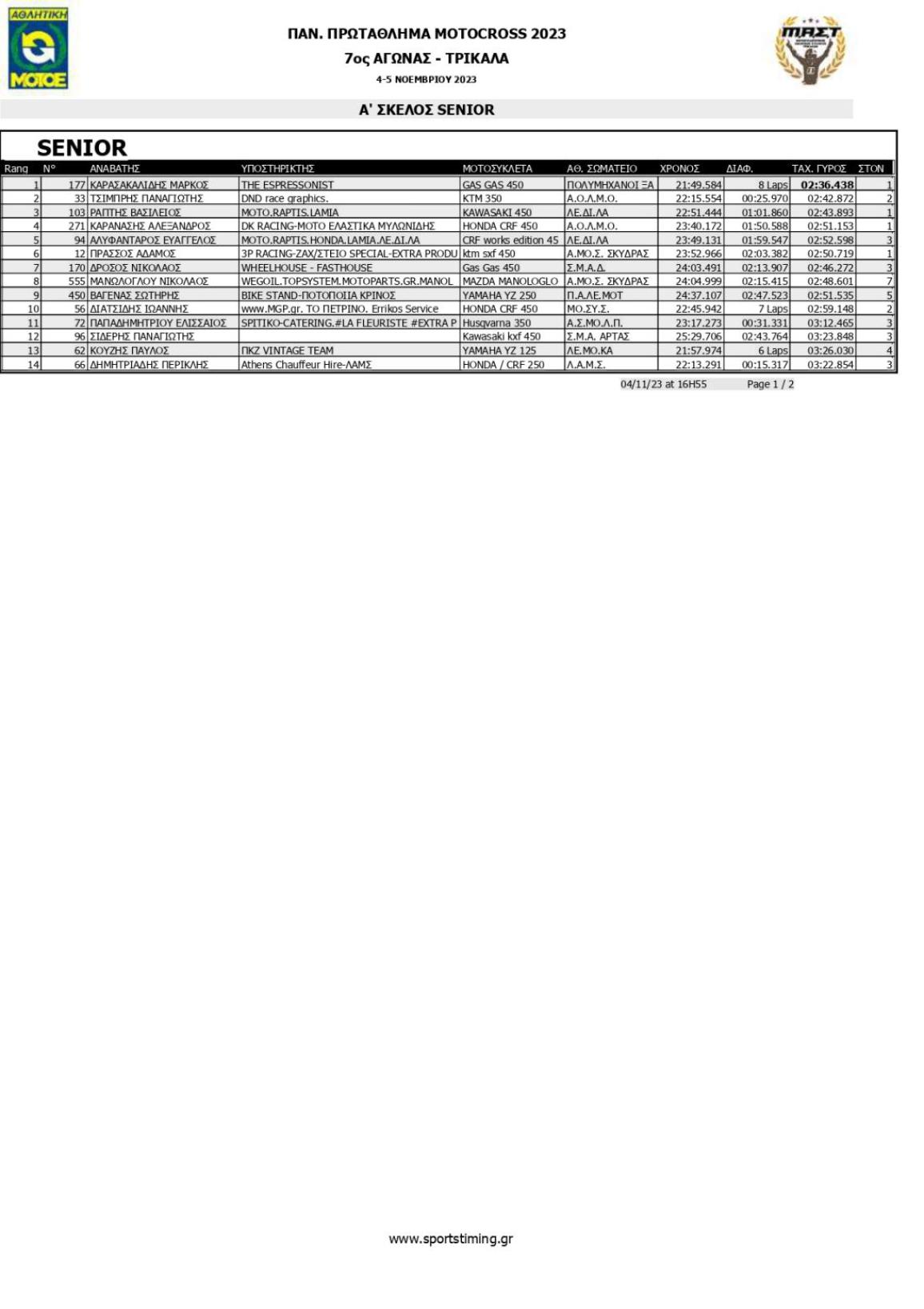 Τελευταίος αγώνας του Σαββάτου ήταν αυτός των Senior - MX Woman, με την βροχή να κάνει για μια ακόμη φορά την εμφάνιση της στην πίστα motocross Πρίνου «Μάκης Κωφός». Με το που έπεσαν οι μπάρες ο συνήθης ύποπτος Μάρκος Καρασακαλίδης #177 πήρε την πρωτοπορία και δεν κοίταξε ποτέ πίσω του, αφήνοντας τους Σπύρο Ράπτη #103 Kawasaki 450 και Παναγιώτη Τσιμπρή #33 KTM 350 να μάχονται για τις δύο θέσεις του βάθρου. Όσον αφορά την MX Woman η Ιωάννα Λάμπρου #7 Yamaha YZF 250 ήταν αυτή που κατάφερε να βρεθεί μπροστά από την αδερφή της Αμαλία #17 Yamaha YZ 125 στην εκκίνηση του αγώνα και οδηγούσε την κούρσα.