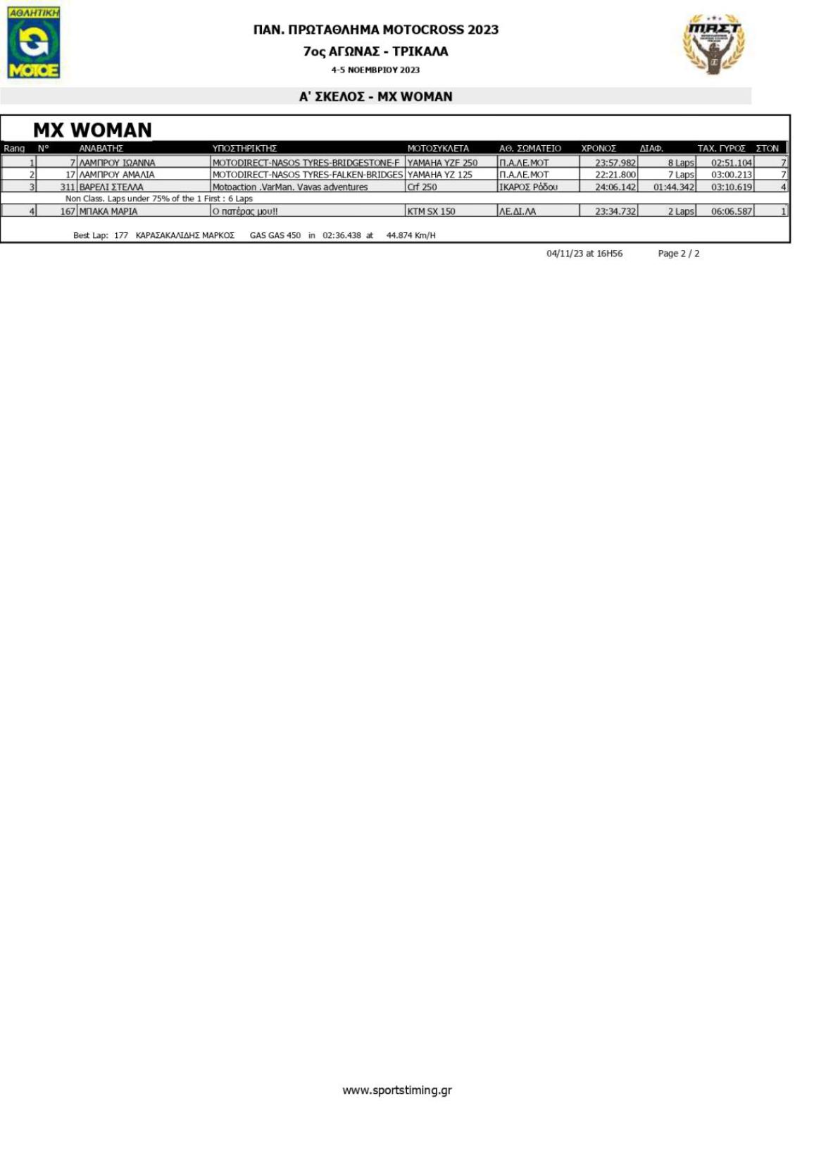 Από την άλλη ο Ράπτης δεν μπορούσε να ακολουθήσει τον ρυθμό του Τσιμπρή, με τον Λαμιώτη οδηγό να προσπαθεί να κρατήσει πίσω του τον Αλέξανδρο Καρανάση #271 Honda CRF 250. Λίγο αργότερα είδαμε τον Καρασακαλίδη να περνά με άνεση τη γραμμή του τερματισμού και να πανηγυρίζει μία ακόμη νίκη στη Senior. Στη δεύτερη θέση ολοκλήρωσε τον αγώνα ο Τσιμπρής με τον Ράπτη να συμπληρώνει το βάθρο. Όσον αφορά την MXW, η Ιωάννα Λάμπρου κατέκτησε τη νίκη, με την αδερφή της Αμαλία να τερματίζει στη δεύτερη και την Στέλλα Βαρελί #311 Honda CRF 250 να ολοκληρώνει το βάθρο. Μετά το τέλος του αγώνα της MXW είχαμε και την ομορφότερη στιγμή της πρώτης ημέρας του 7ου γύρου του Πανελληνίου Πρωταθλήματος Motocross, καθώς η Στέλλα Βαρέλι δέχθηκε πρόταση γάμου από τον εκλεκτό της καρδιάς της με την ίδια να απαντά θετικά.