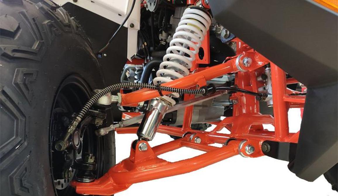 Στα φρένα βρίσκουμε έναν δίσκο σε κάθε τροχό, με τους δύο μπροστινούς στα 160 χιλιοστά, και τους πίσω στα 220 χιλιοστά. Τα διπλά ψαλίδια μπροστά συνδυάζονται με δύο ανεξάρτητα ενισχυμένα αμορτισέρ, τα οποία ρυθμίζονται ως προς την προφόρτισή. Τα ελαστικά είναι 22x7-12 μπροστά και 255/50-12, πίσω.