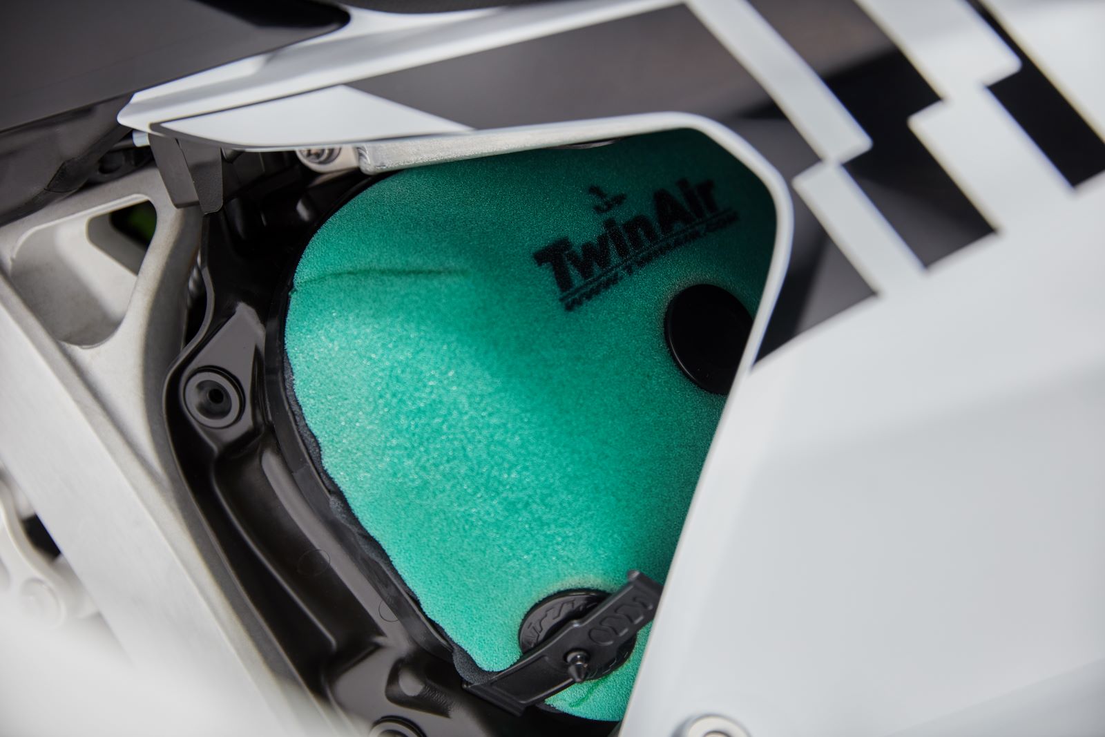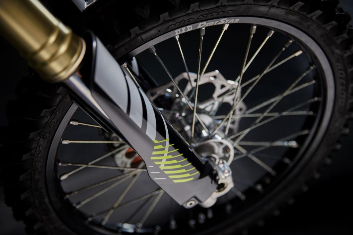 Εμπρός έχουμε το πιρούνι AOS της KYB με καλάμια 48 χιλιοστών σφυρήλατους επεξεργασμένους τριπλούς σφιγκτήρες αλουμινίου 7075-T6 και ένα πλήρως ρυθμιζόμενο πίσω αμορτισέρ με piggyback. Τα φρένα είναι της Brembo με πλευστή δαγκάνα δύο εμβόλων στα 24 χλστ και πλευστή πίσω δαγκάνα μονού εμβόλου 26 χλστ και δίσκους Galfer 260 χλστ μπροστά και 220 χλστ πίσω. Οι ζάντες είναι αλουμινίου DirtStar 7000 Series με επεξεργασμένα κέντρα αλουμινίου και φοράνε ελαστικά Pirelli Scorpion MX32 mid-soft. Το τιμόνι είναι Pro-Taper ACF carbon core και τα γκριπ ODI half-waffle ολοκληρώνοντας ένα αρκετά αγωνιστικό σύνολο.
