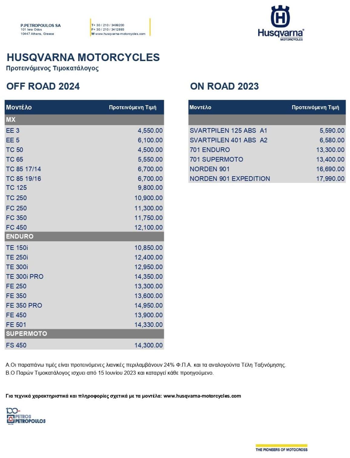 Ο νέος τιμοκατάλογος περιλαμβάνει όλα τα μοντέλα της Husqvarna, μοντέλα δρόμου αλλά και για Off-Road χρήση. Θυμίζουμε ότι τα enduro του 2024 έχουν δεχτεί σημαντικές αναβαθμίσεις, για τις οποίες θα διαβάσετε τις πρώτες μας εντυπώσεις στο επόμενο τεύχος του ΜΟΤΟ, δια χειρός Κίμωνα Καράμπελα, που οδήγησε τις μοτοσυκλέτες στην πρώτη παγκόσμια παρουσίαση τους, στη Νορβηγία.