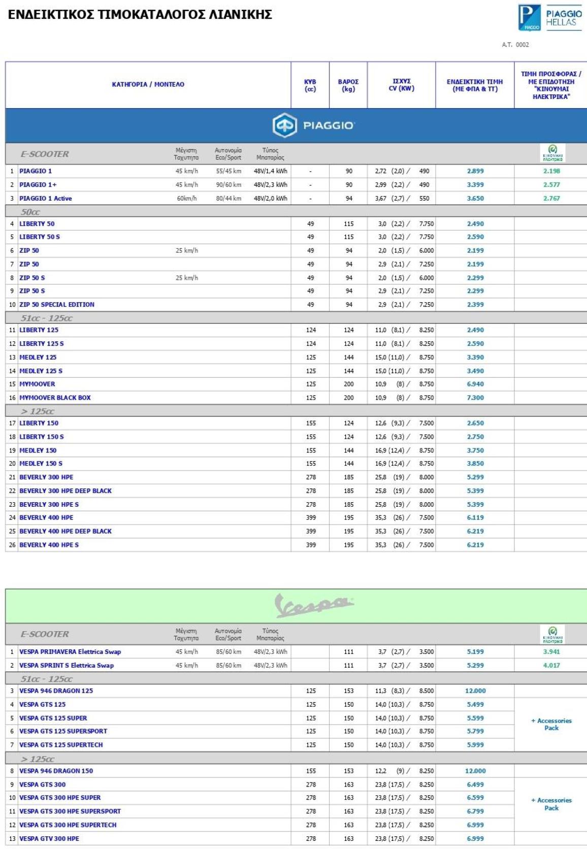 Η Piaggio Hellas έδωσε στη δημοσιότητα τους νέους τιμοκαταλόγους για τις Aprilia, Piaggio, Moto Guzzi και Vespa, οι οποίοι έχουν άμεση ισχύ.