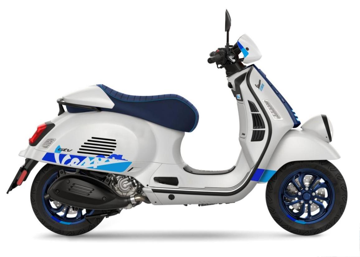 Η ειδική έκδοση χαρακτηρίζεται από το μπλε και το γαλάζιο σε λευκό αμάξωμα, τα θεσμικά χρώματα του Ομίλου Piaggio, τα οποία αλληλεπιδρούν με τα κλασικά γραφικά και το νέο μονόγραμμα Vespa, καθώς και το εορταστικό λογότυπο των 140 χρόνων. Αυτά τα χρώματα ενισχύουν επίσης την κλασική “γραβάτα” στη μπροστινή ποδιά, το χαρακτηριστικό στοιχείο κάθε Vespa, σχεδιασμένη με τριπλούς αεραγωγούς και στις δύο πλευρές και κεντρικές γρίλιες. Το μπροστινό φέρινγκ θυμίζει επίσης το αγωνιστικό πνεύμα που εμπνέει τη Gtv.