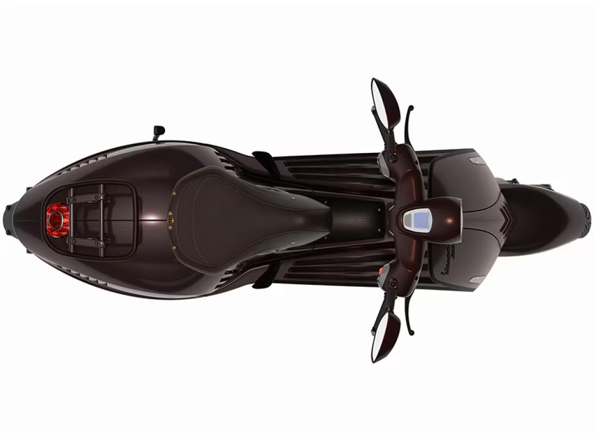 Το αυτοφερόμενο πλαίσιο παραμένει κατασκευασμένο από αλουμίνιο, με νέα βαφή σε μεταλλική απόχρωση και λεπτομέρειες σε θερμούς τόνους. Στη σέλα συναντάμε επένδυση υψηλής ποιότητας, με ραφές που παραπέμπουν σε χειροποίητο προϊόν, ενώ ειδικά λογότυπα στο σχήμα πετάλου κοσμούν το scooter στο πλάι, κάτω από τη σέλα.