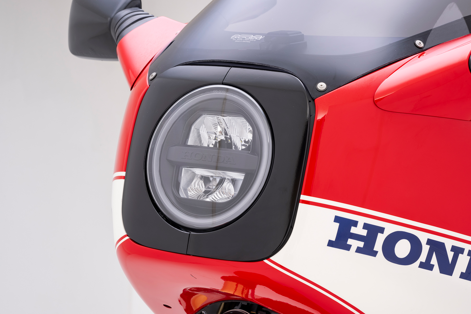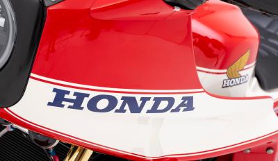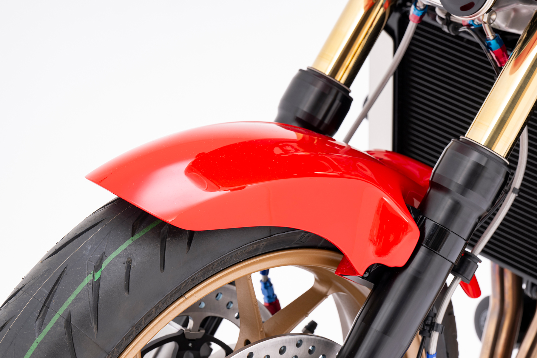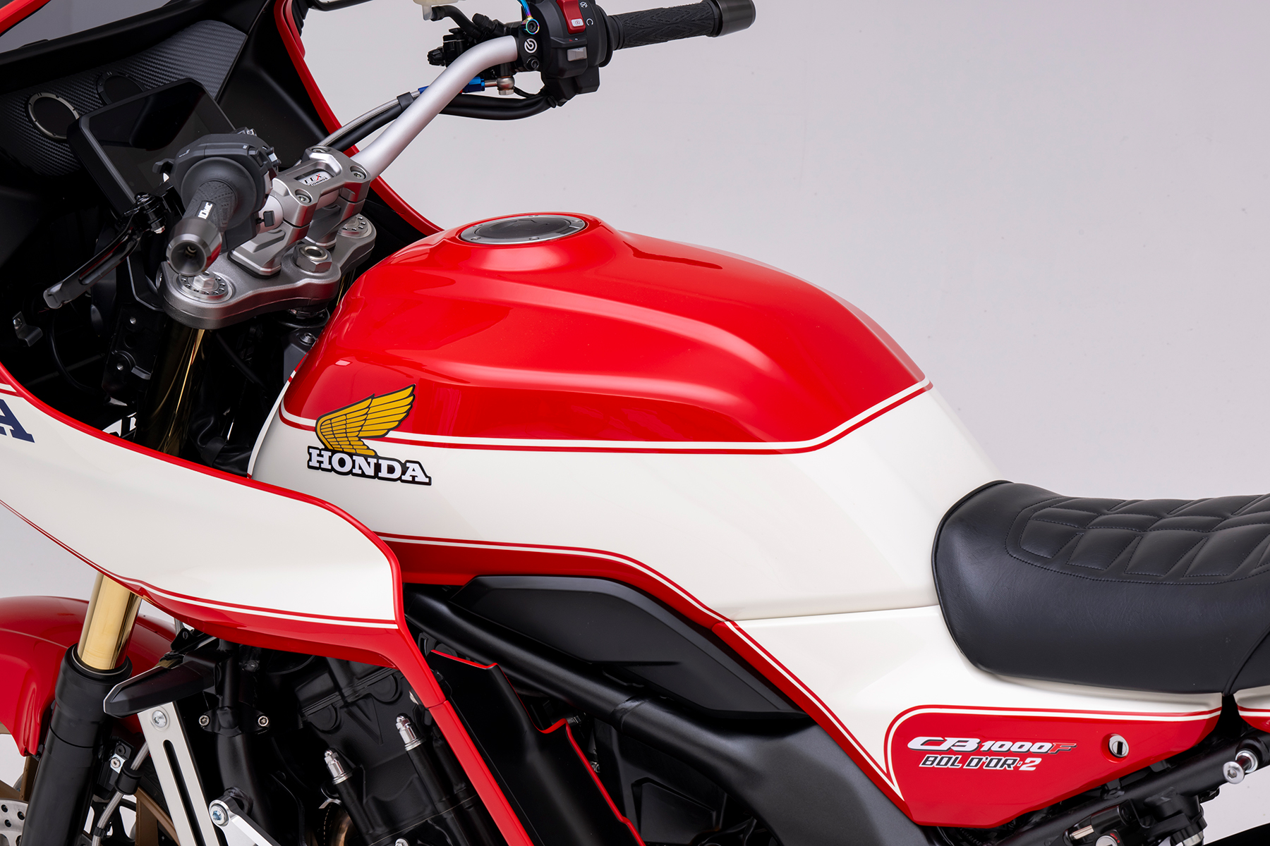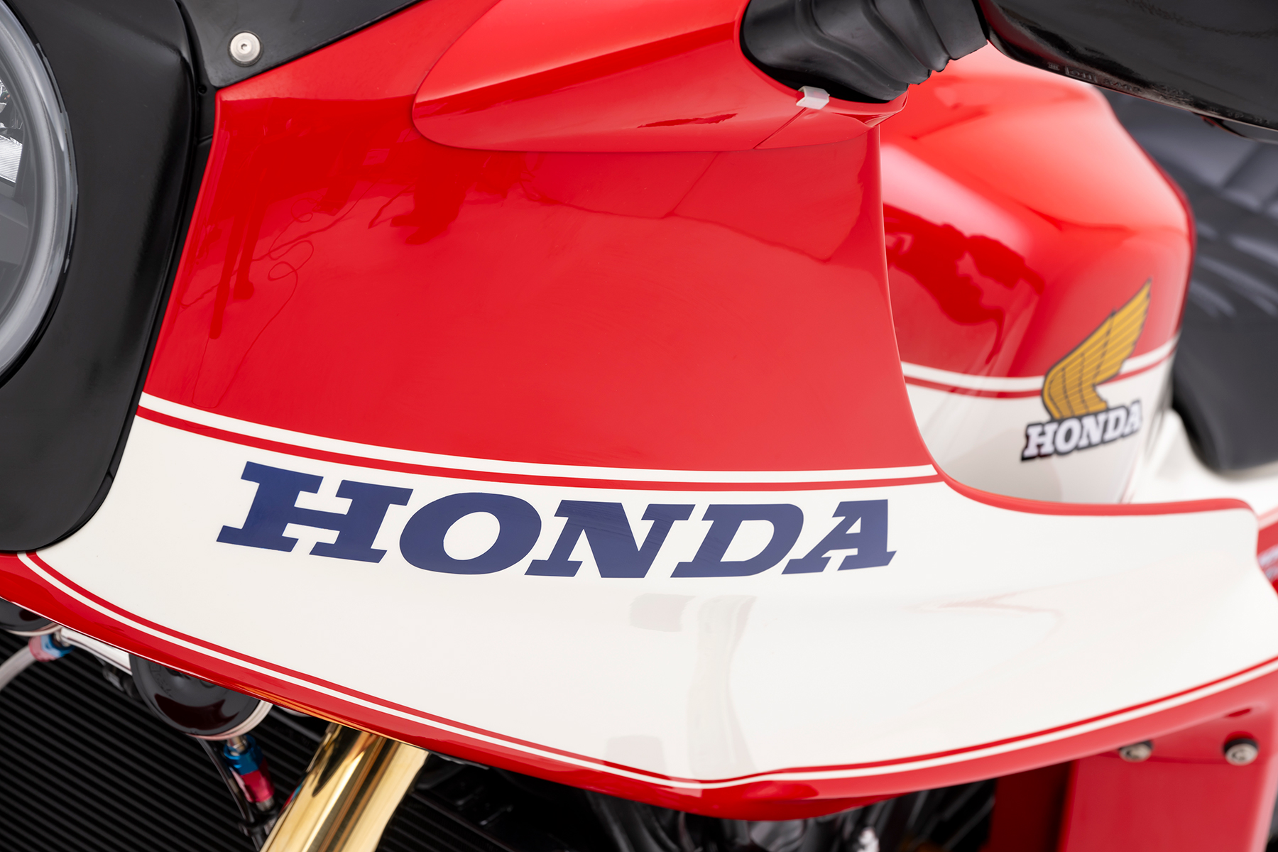Η λευκή και κόκκινη βαφή στο φαίρινγκ, το ρεζερβουάρ, το φτερό, τα πλαϊνά καλύμματα και την ουρά αποτελεί δημιουργία της Tonnappu Paintworks, η οποία δεν παρέλειψε να προσθέσει και το χρυσό φτερό της Honda στο ρεζερβουάρ.