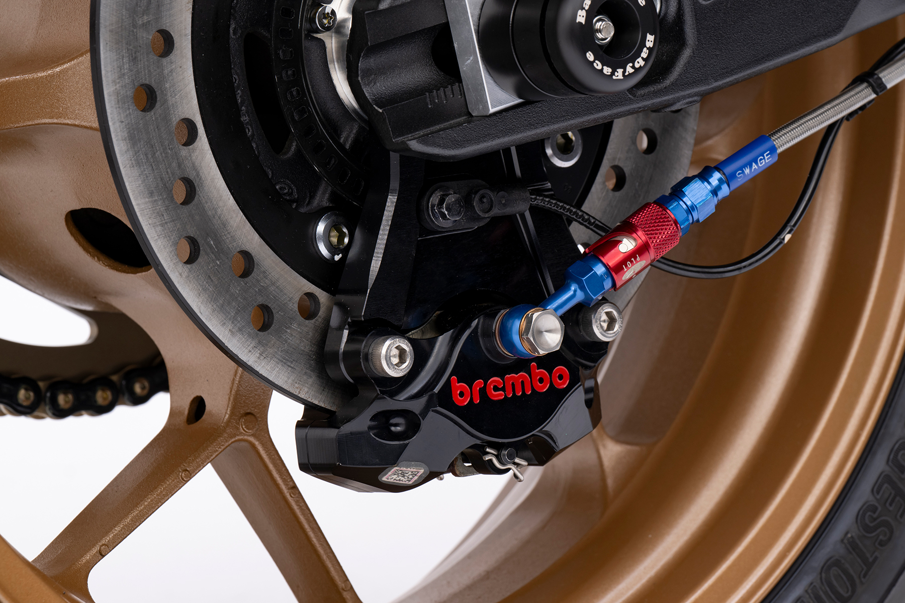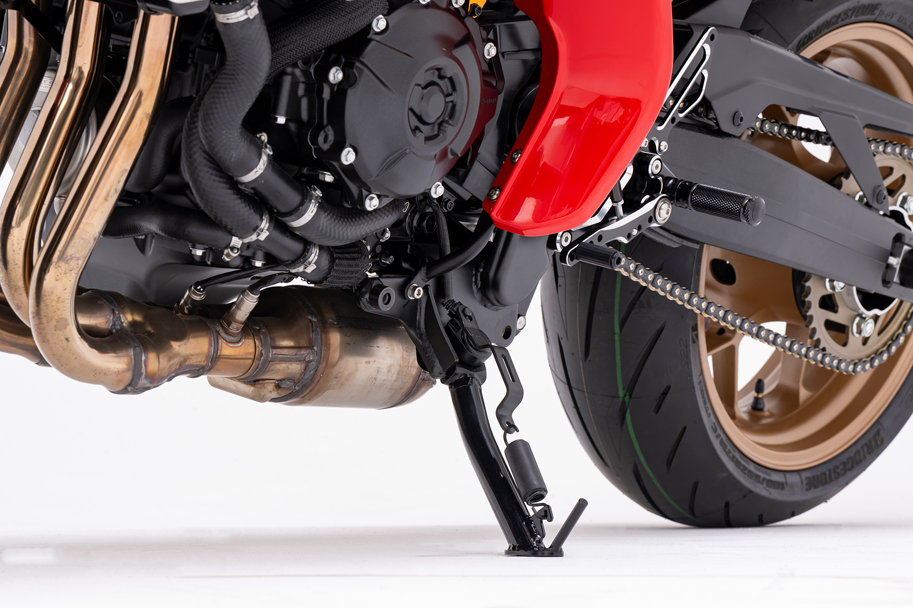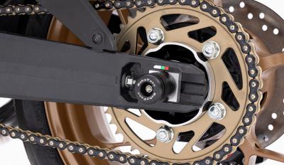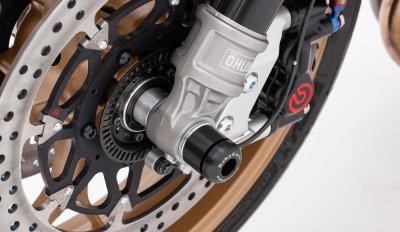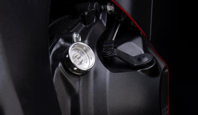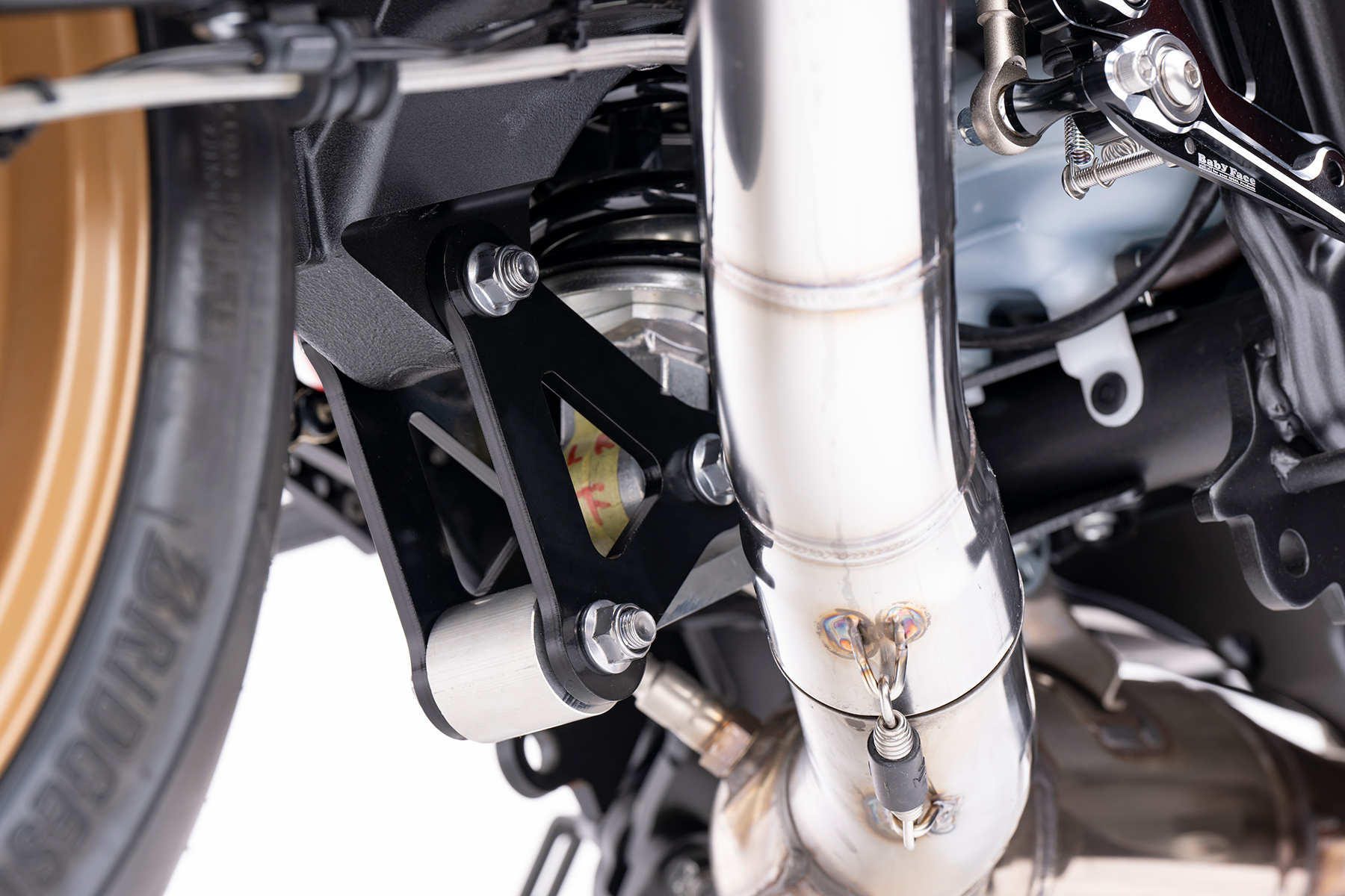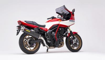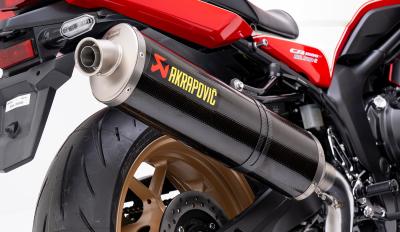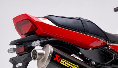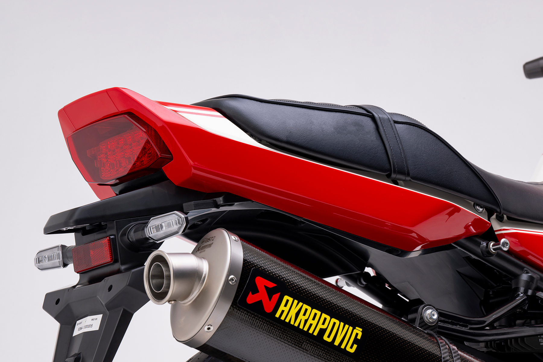 Νέα είναι η εξάτμιση της Akrapovic, με carbon οβάλ τελικό που βρίσκεται πιο ψηλά από ότι θα έπρεπε κατά τη γνώμη μας, ενώ διατηρούνται τα σύγχρονα LED φλας -θα θέλαμε να βλέπαμε αντικατάστασή τους με μεγάλα παραδοσιακά πορτοκαλί φλας εποχής.