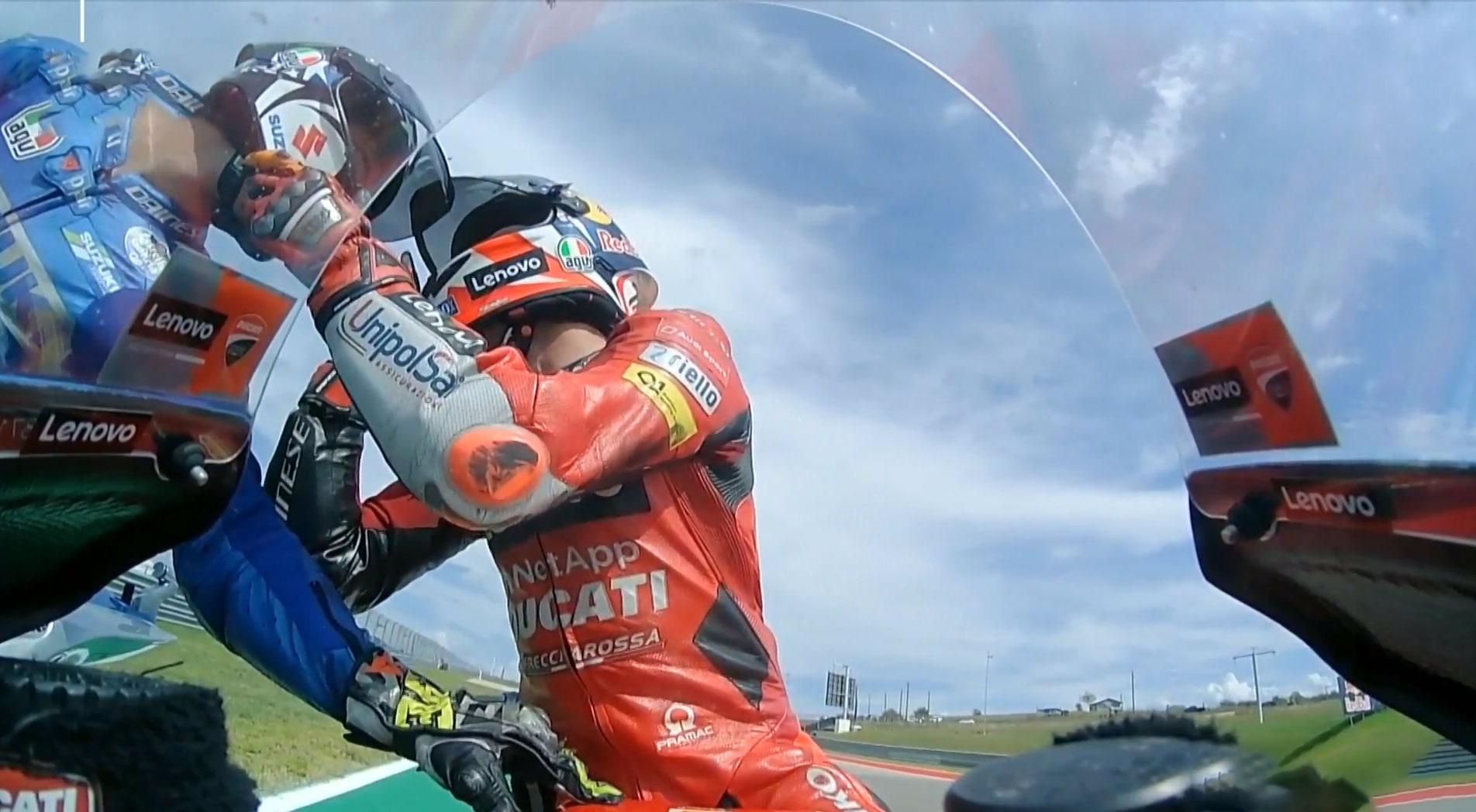 Στην τελευταίο γύρο ο Mir έκανε μία απέλπιδα προσπάθεια να περάσει τον Miller, χτύπησε επάνω του και τον ανάγκασε να ανοίξει γραμμή με τον Bastianini να περνά από την εσωτερική και τους δύο. Να δεχτεί ο Miller επαφή από κάποιον είναι δύσκολο, από τον Mir δύο φορές δυσκολότερο, ιδιαίτερα με τον τρόπο που αυτή έγινε. Τον έπιασε μετά από το κράνος και του μίλησε ακριβώς όπως θα έκανε αν ήταν σε φανάρι της παραλιακής… Θα μπορούσε να το κάνει όταν δεν γράφουν κάμερες αλλά ο Miller δεν κρατιέται και είχε και δίκιο. Η μόνη δικαιολογία για τον Mir ήταν πως εκείνη την στιγμή συνειδητοποιούσε πως είναι και μαθηματικά εκτός παιχνιδιού για το πρωτάθλημα, που έτσι κι αλλιώς ήταν με το ένα πόδι εκτός.