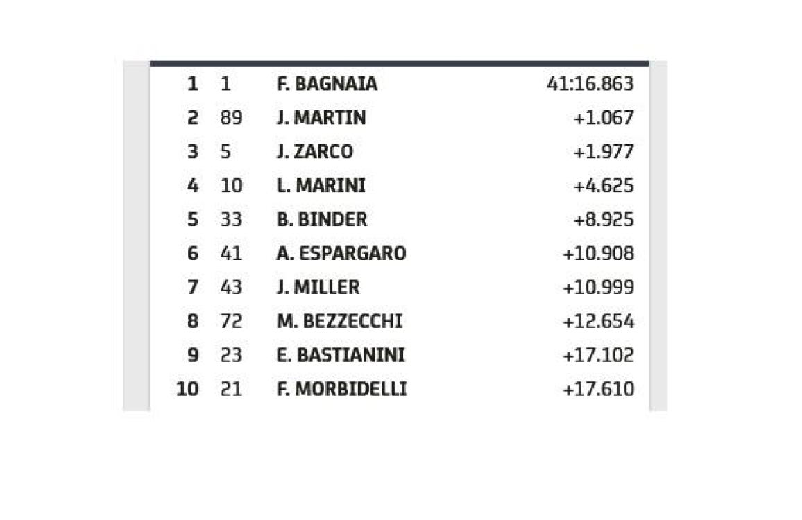 Οπότε με τα τελευταία δευτερόλεπτα κυλούσαν βλέποντας τον Bagnaia να βολτάρει μέχρι την καρό σημαία και πίσω του τον martin που είχε επιλέξει soft πίσω ελαστικό και ήταν αδύνατόν να πιέσει για να φτάσει τον Bagnaia. Πίσω από τον Martin τερμάτισε φυσικά ο Zarco που για άλλον έναν αγώνα έδειξε πόσο δυνατός μπορεί να γίνει στους τελευταίους γύρους.