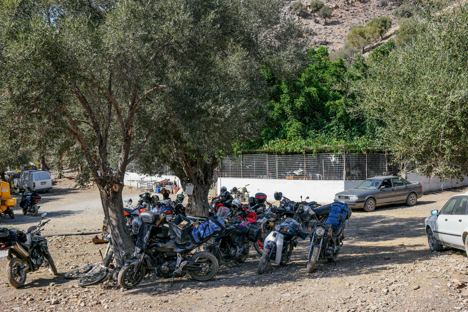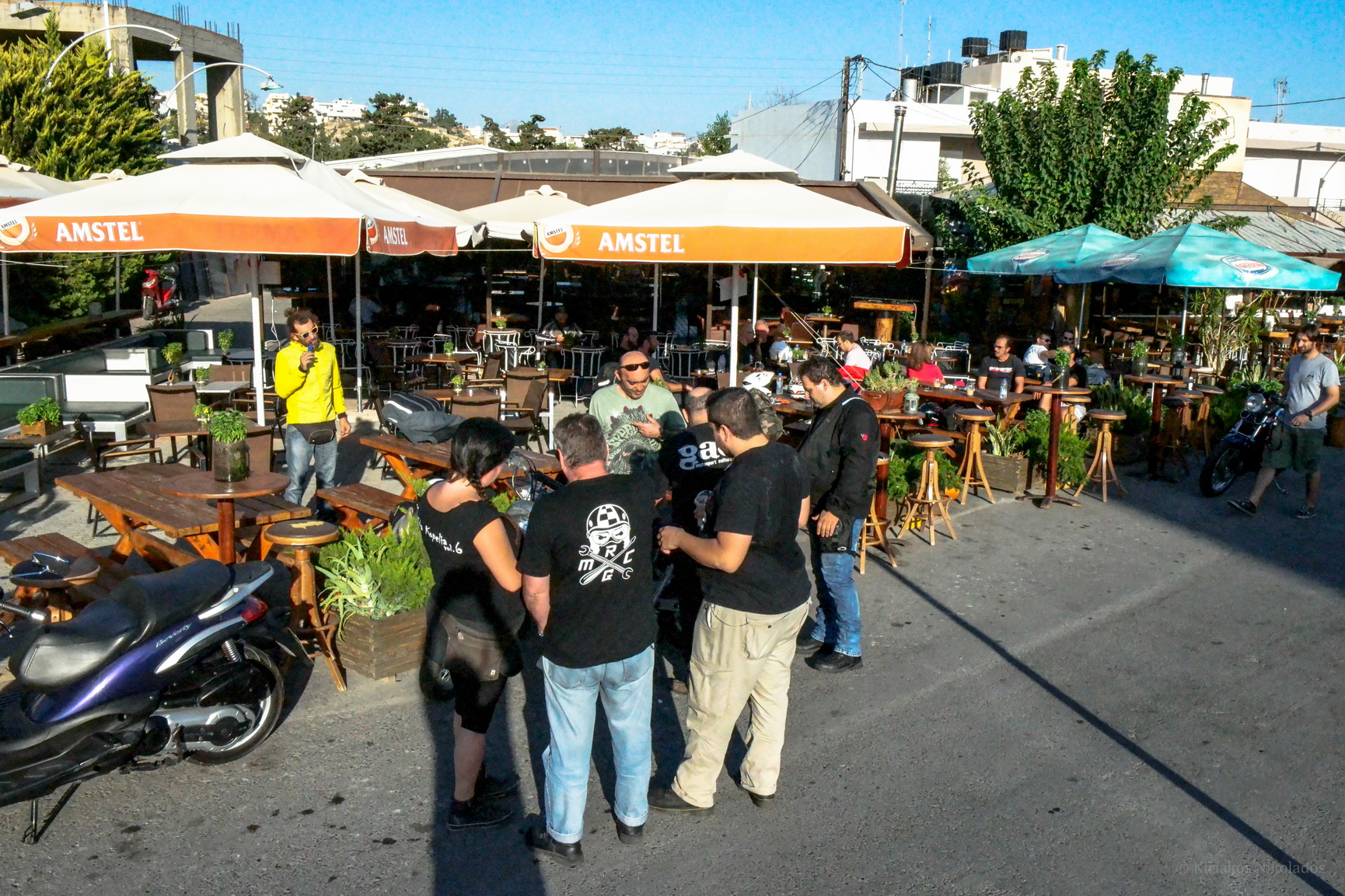 Το ανακοίνωσα ως χαρμόσυνο γεγονότο στο MRCG κι άρχισαν να ανεβαίνουν οι συμμετοχές. Το πρωί της 20ης Αυγούστου έξω απ’ το Streat καφέ στο Ηράκλειο ήταν το κάτι άλλο. Fireblade, και μάλιστα δυο, το ένα σε Rothmans βάψιμο. Ρωτάω τον Βασίλη τον Κέκκο με το ένα Fireblade αν θέλει να του δώσω το KLR: «Μπα άσε μωρέ, θα ρθω με το Blade να κάνω παρέα και στο παιδί» (τον Νικολάτο με το άλλο Blade). Ένα Husky 610. XT500 custom. XT600 custom, αδερφάκι. DR125 του Φράγγου, Yamaha GTS1000 του Μικελάκη, Goldwing, DR800big. CB500, CBR600F, TT600R, πάπια 90άρα, XLR500 ναξιώτικο του Δημήτρη του Συρίγου, δυο Enfield, το ένα απ’ αυτά το ‘Εντικόπτερο’ του Διονύση… τι να πω και τι ν’ αφήσω. Και ξεκινάμε άσφαλτο.