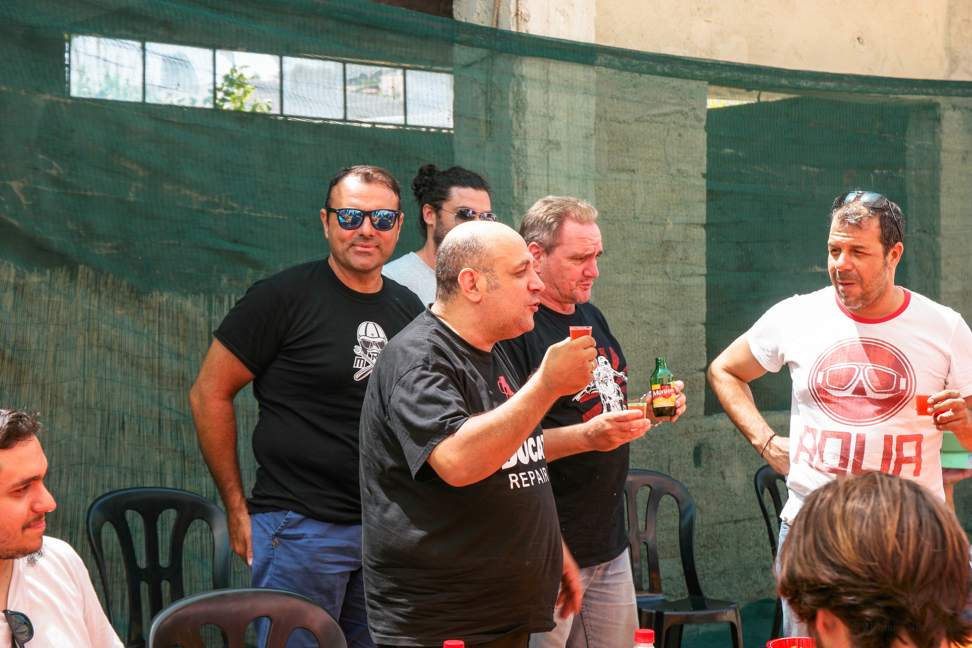 Το βράδυ γέλια και χαβαλές. Έχουμε κάτσει για μπύρες και βλέπω τον Πίτσο να έρχεται με δρασκελιές στο τραπέζι κατακόκκινος και να φωνάζει ΜΙΑ ΜΠΥΡΑ. Ακολουθεί ένας απ’ τους πολλούς μαγικούς διαλόγους: