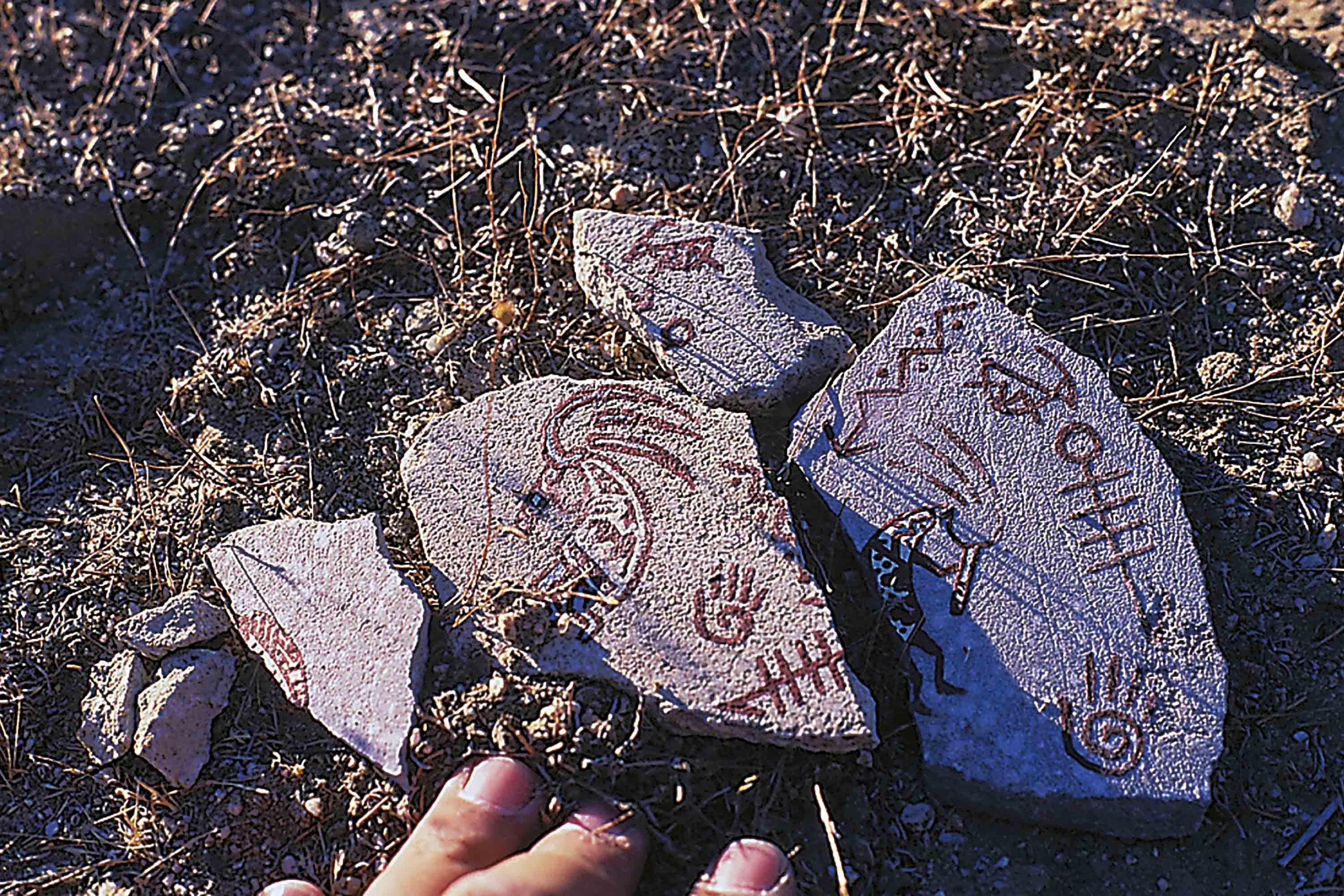 Ο Ινδιάνος μπροστά, το Ψημένο Πόδι πίσω, σκαρφάλωσαν από ένα στενό μονοπάτι ώσπου έφτασαν ψηλά σ’ ένα πλινθόκτιστο χάλασμα γαντζωμένο στον εξωτερικό τοίχο του φαραγγιού. Το γέρο-Κογιότ στάθηκε απ’ έξω και του έγνεψε να προχωρήσει. Ο δικός μας έσκυψε και μπήκε μέσα. Στο πάτωμα σκόρπια κτερίσματα κεραμικής τέχνης που έδειχναν το Κοκοπέλλι, τον Διόνυσο των Ναυαγών, και κομμάτια μιας πήλινης λήκυθου με σχέδια της Μέσης Γεωμετρικής Περιόδου. Η ματιά του πάγωσε όταν ανάμεσα στα θραύσματα ξεχώρισε ένα που έφερε καθαρά χαραγμένο στην Ιωνική διάλεκτο το αινιγματικό επίγραμμα: “ΠΟΥΠΑΣΡΕΚΑΡΑΜΗΤΡΟ”. Με χέρι που έτρεμε τα μάζεψε βιαστικά και βγήκε.