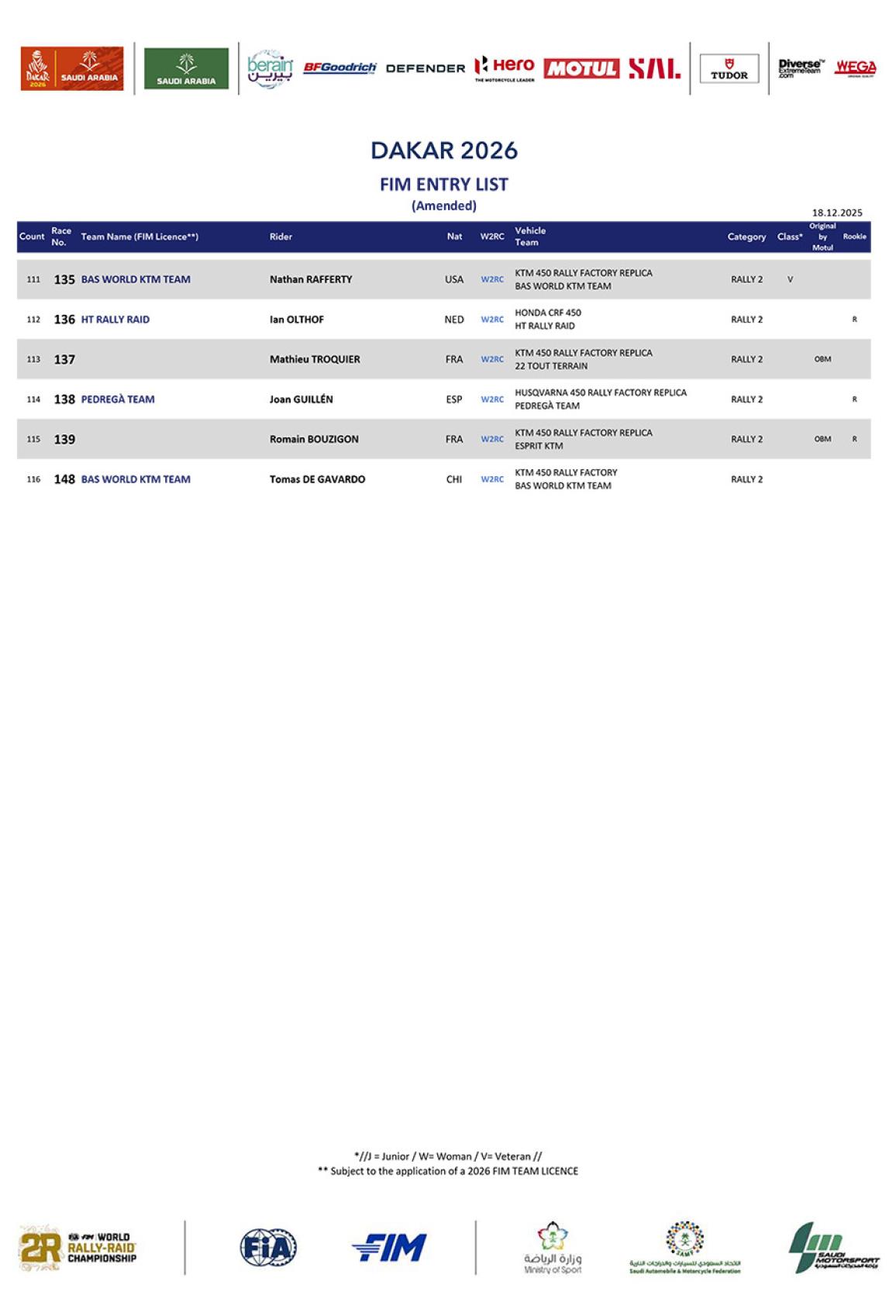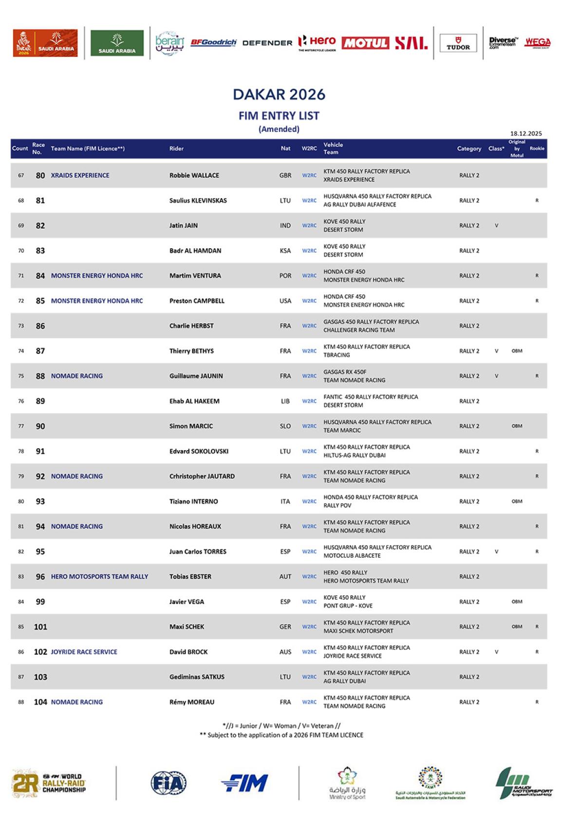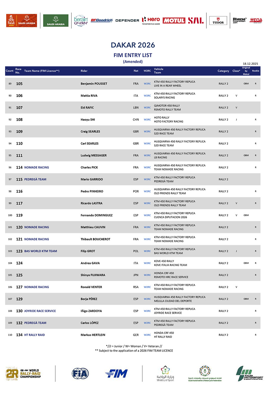Μεγάλο φαβορί παραμένει ο Sanders, περσινός νικητής του Dakar, όμως η Honda καραδοκεί για άλλη μία χρονιά με πολύ δυνατή ομάδα, έχοντας Brabec και Howes στην πρώτη γραμμή και Van Beveren όμως, τον μόνο άνθρωπο που έφτασε κοντά στο να νικήσει με Yamaha και τον σταμάτησε μία σφοδρή πτώση, όπως επίσης και η KTM έχει Canet και Benavides.