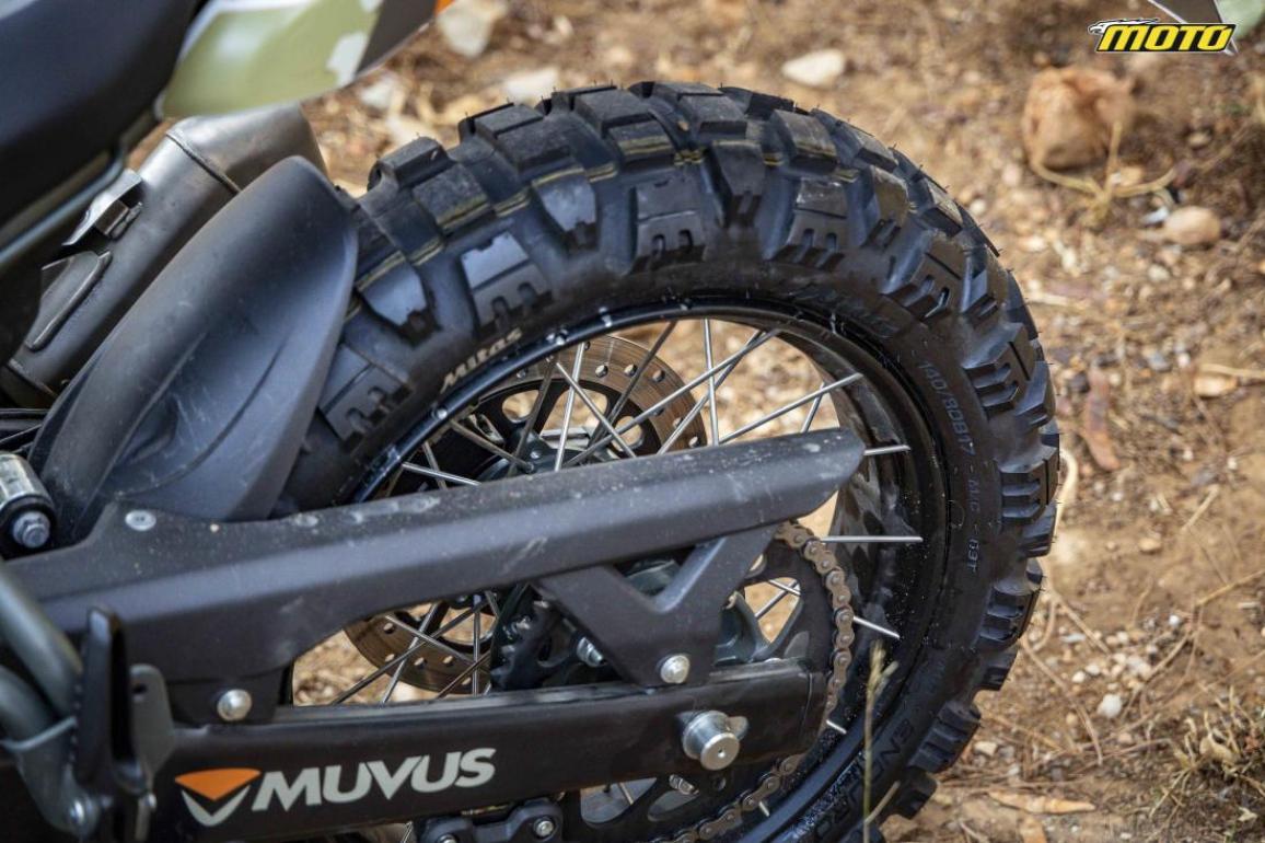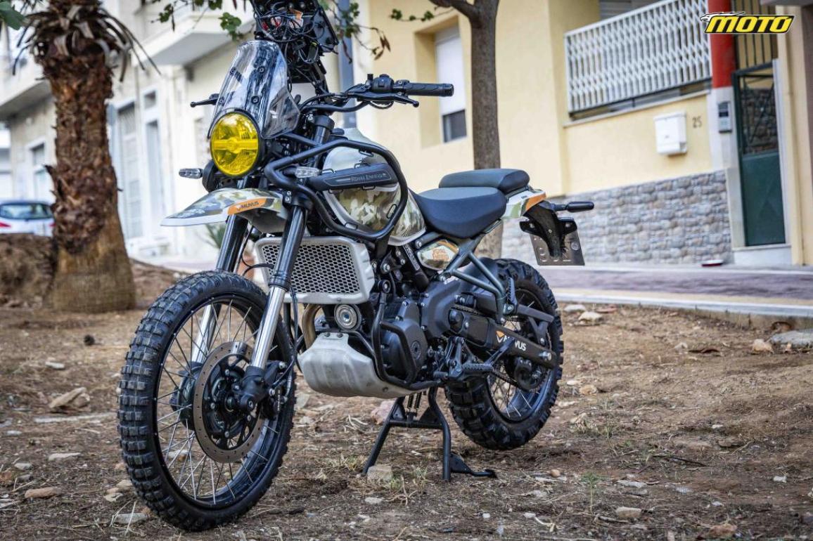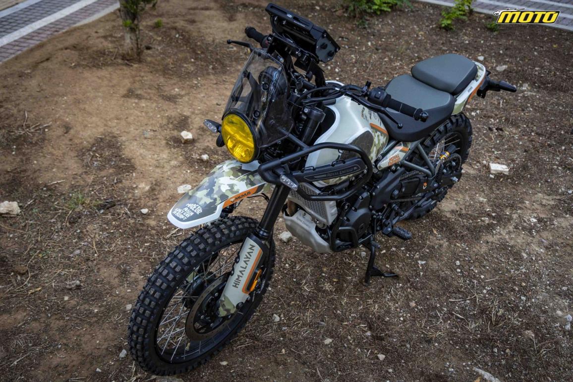 Φυσικά για την πρόσφυση φροντίζουν τα ελαστικά της Mitas, συγκεκριμένα τα Enduro Trail XT και έχουν γεμίσει με mousse, ενώ τελευταία μετατροπή στο κατά τα άλλα στάνταρ Himalayan αφορά τα προστατευτικά των καλαμιών που έχουν κοπεί από το φτερό και έχουν τοποθετηθεί εκ νέου στο πιρούνι.