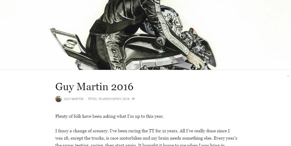 Επικαιρότητα 20/1/2016 Ο Guy Martin θα απέχει από το φετινό Isle of Man TT Με ανάρτησή του εχθές το απόγευμα, ο Guy Marin ενημέρωσε τους οπαδούς του Isle of Man ότι δεν θα αγωνιστεί για το 2016, και άφησε ανοικτό το ενδεχόμενο να επιστρέψει για το 2017.Ο βασικός λόγος, είναι...
